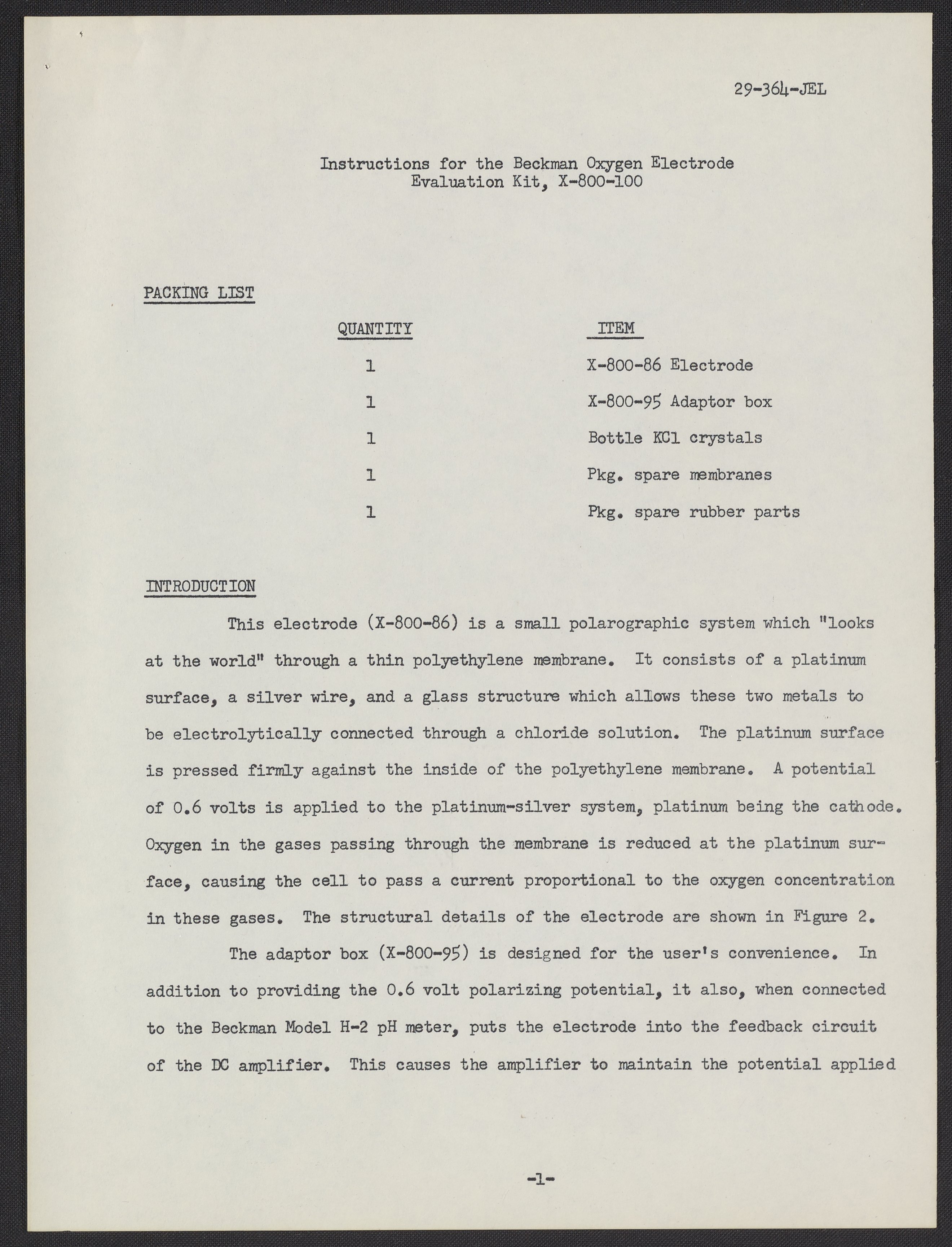 Instructions for the Beckman Oxygen Electrode Evaluation Kit, X-300-100 (final)