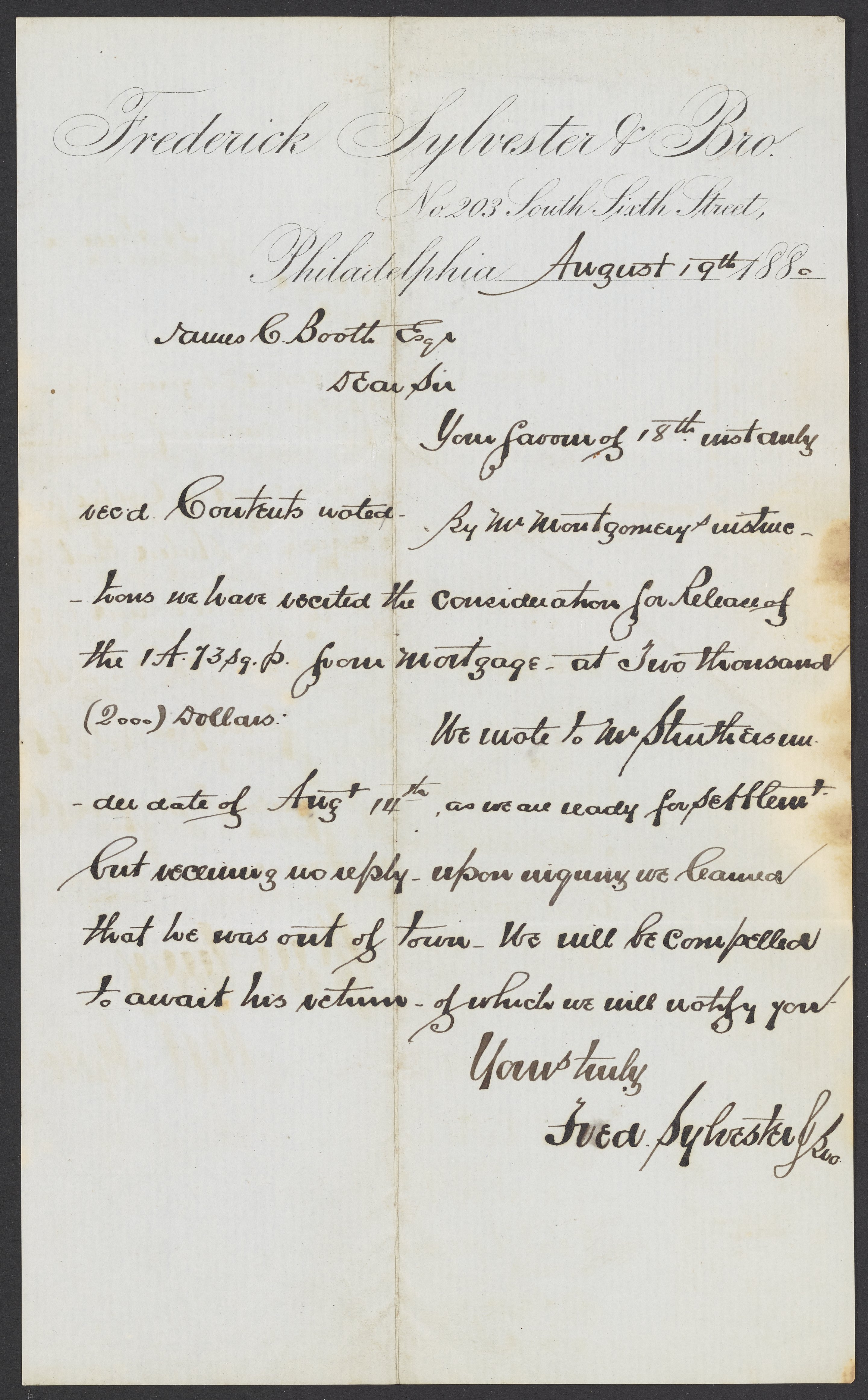 Letter from Frederick Sylvester & Brother to James Curtis Booth, August 19, 1880