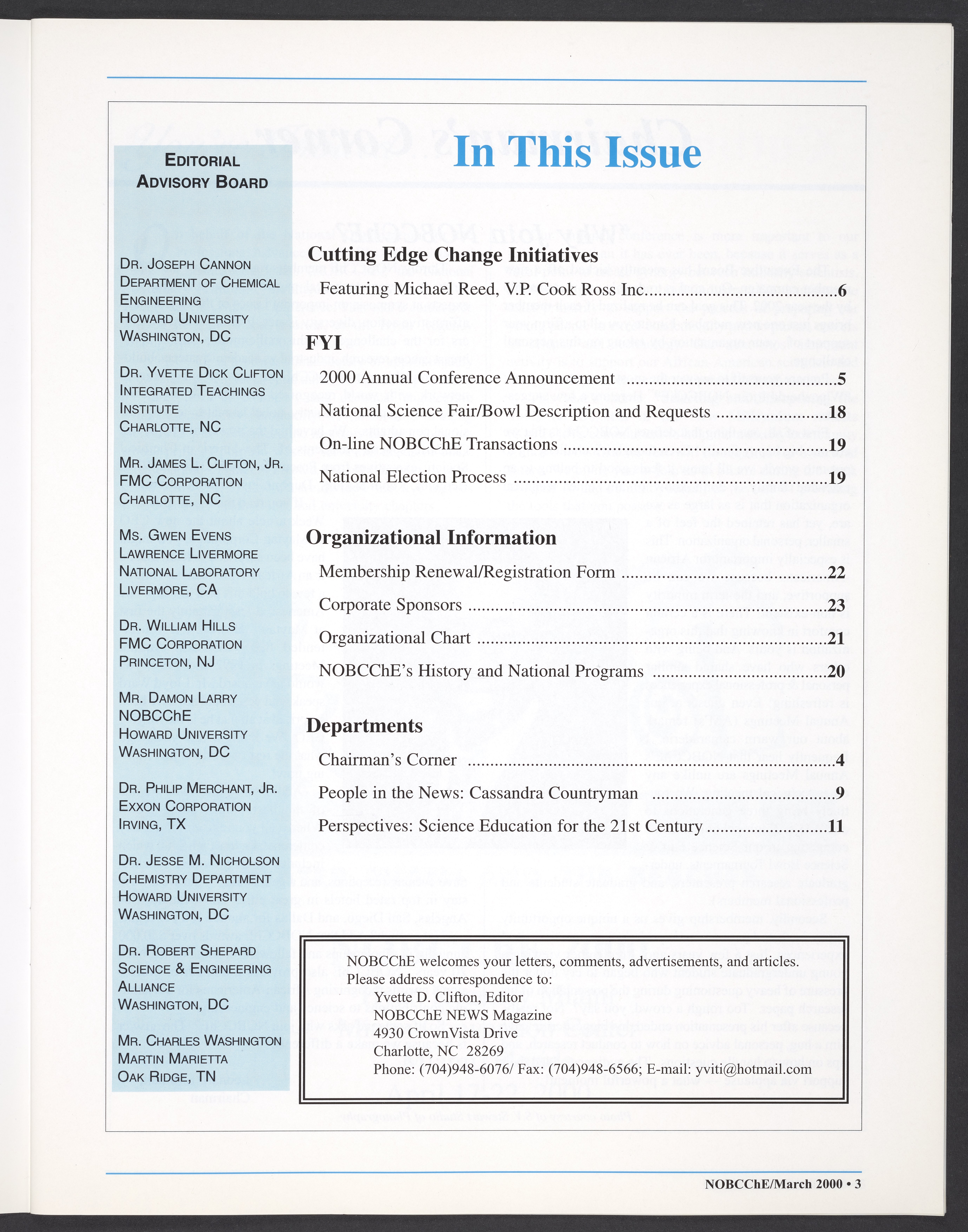 “NOBCChE News, Volume 30, Number 1.” Washington (D.C.): National Organization for Black Chemists and Chemical Engineers, March 2000. William A. Lester, Jr. Papers, Box 46, Folder 34. Science History Institute. Philadelphia. https://digital.sciencehistory.org/works/kdzr6dj.