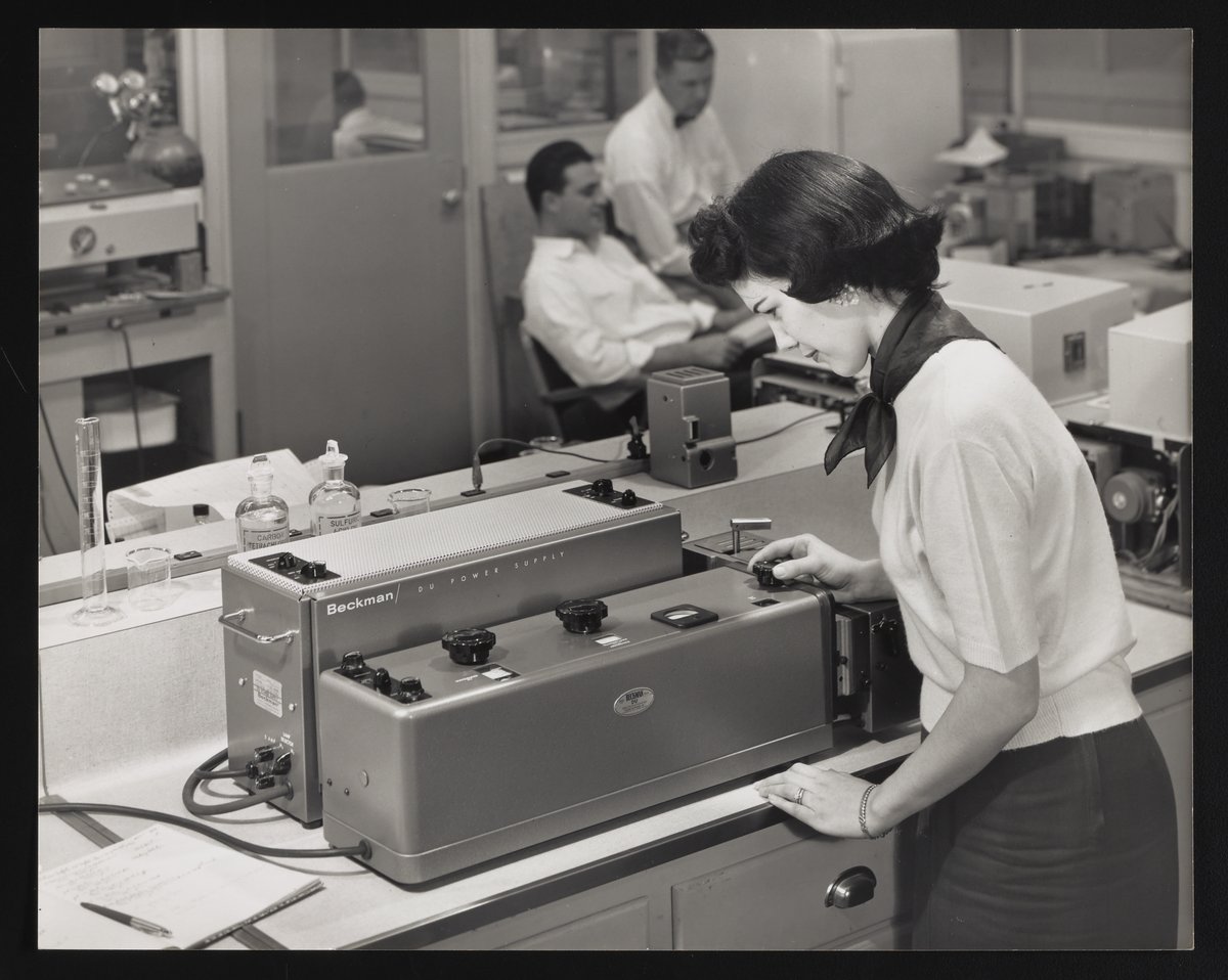 “Woman Adjusting a Beckman DU Spectrophotometer,” n.d. Beckman Historical Collection, Box 81. Science History Institute. Philadelphia. https://digital.sciencehistory.org/works/kh04dp85p.