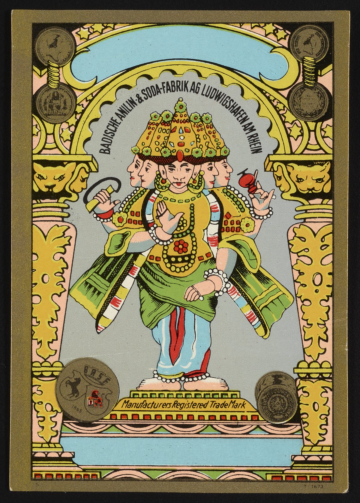 Dye label depicting a caricature of a deity figure with multiple hands and heads, stereotyping Hindu gods and goddesses. Hindu symbols were used by Badische Anilin & Soda-Fabrik (BASF) on their company's dye labels because India was one of the earliest producers of indigo dye. BASF began the industrial production of synthetic indigo in 1897. The decorative border includes the BASF trademark insignia.