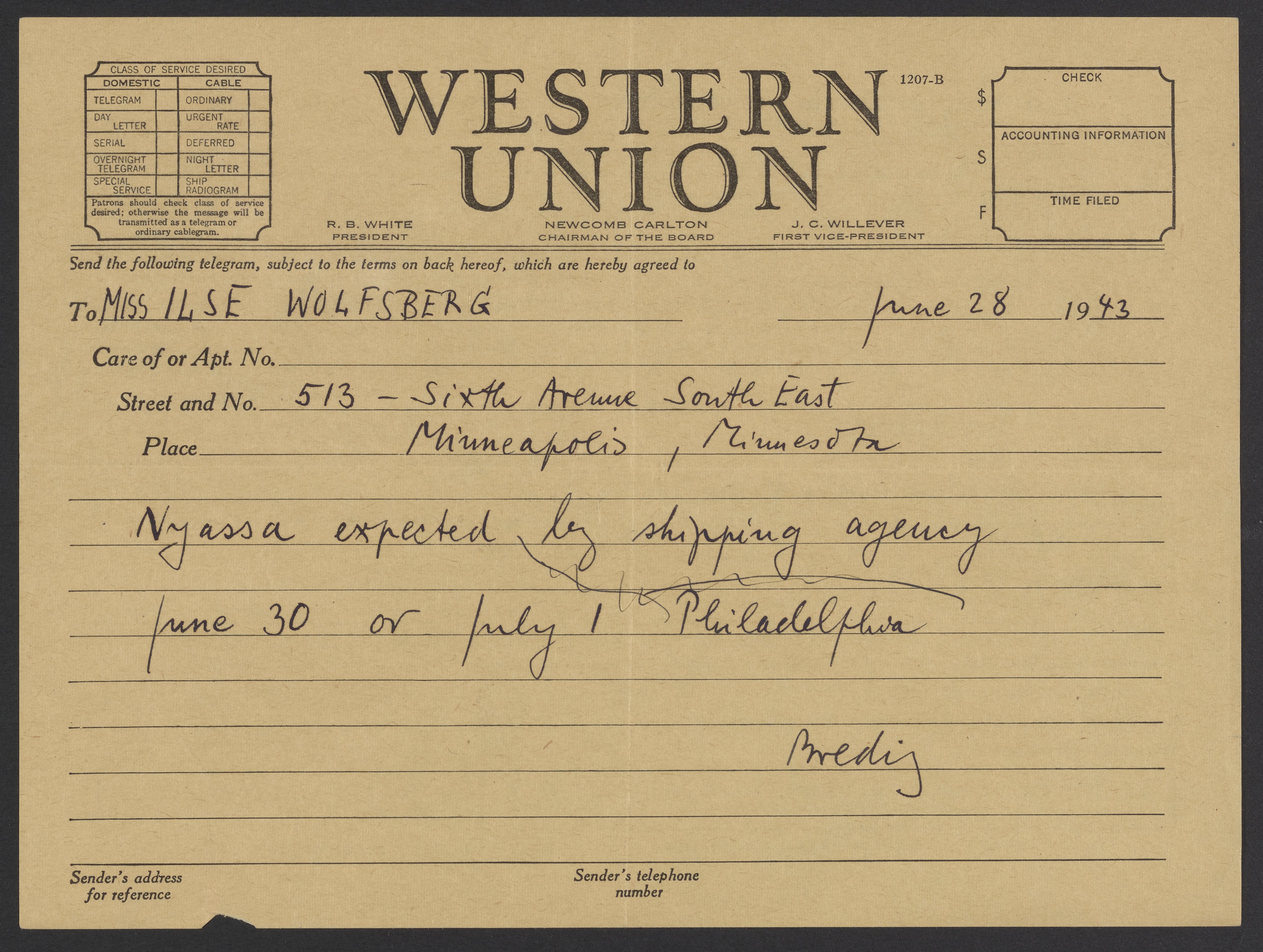 Bredig, Max Albert. “Telegram from Max Bredig to Ilse Wolfsberg, June 28, 1943,” June 28, 1943. Papers of Georg and Max Bredig, Box 9, Folder 25. Science History Institute. Philadelphia. https://digital.sciencehistory.org/works/kh970k5.
