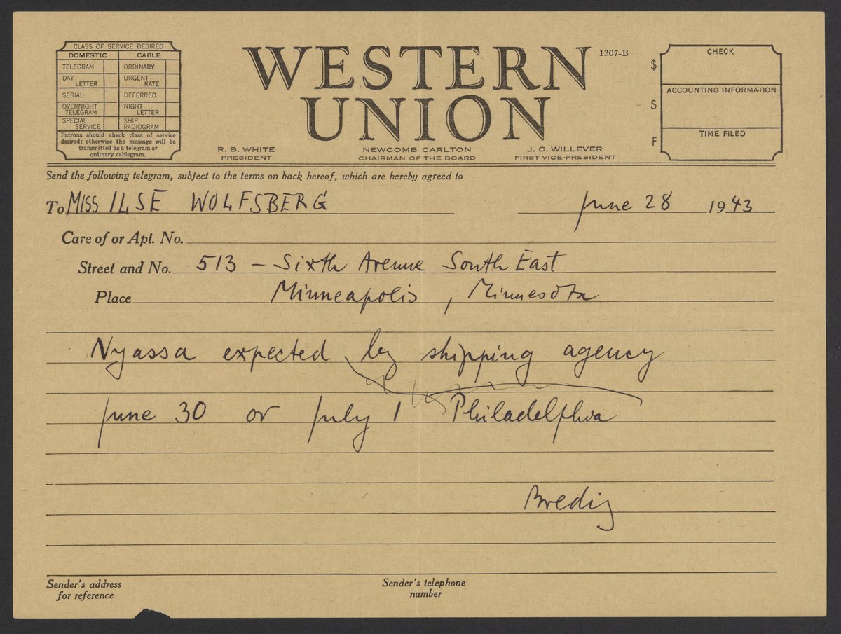 Telegram from Max Bredig to Ilse Wolfsberg, June 28, 1943