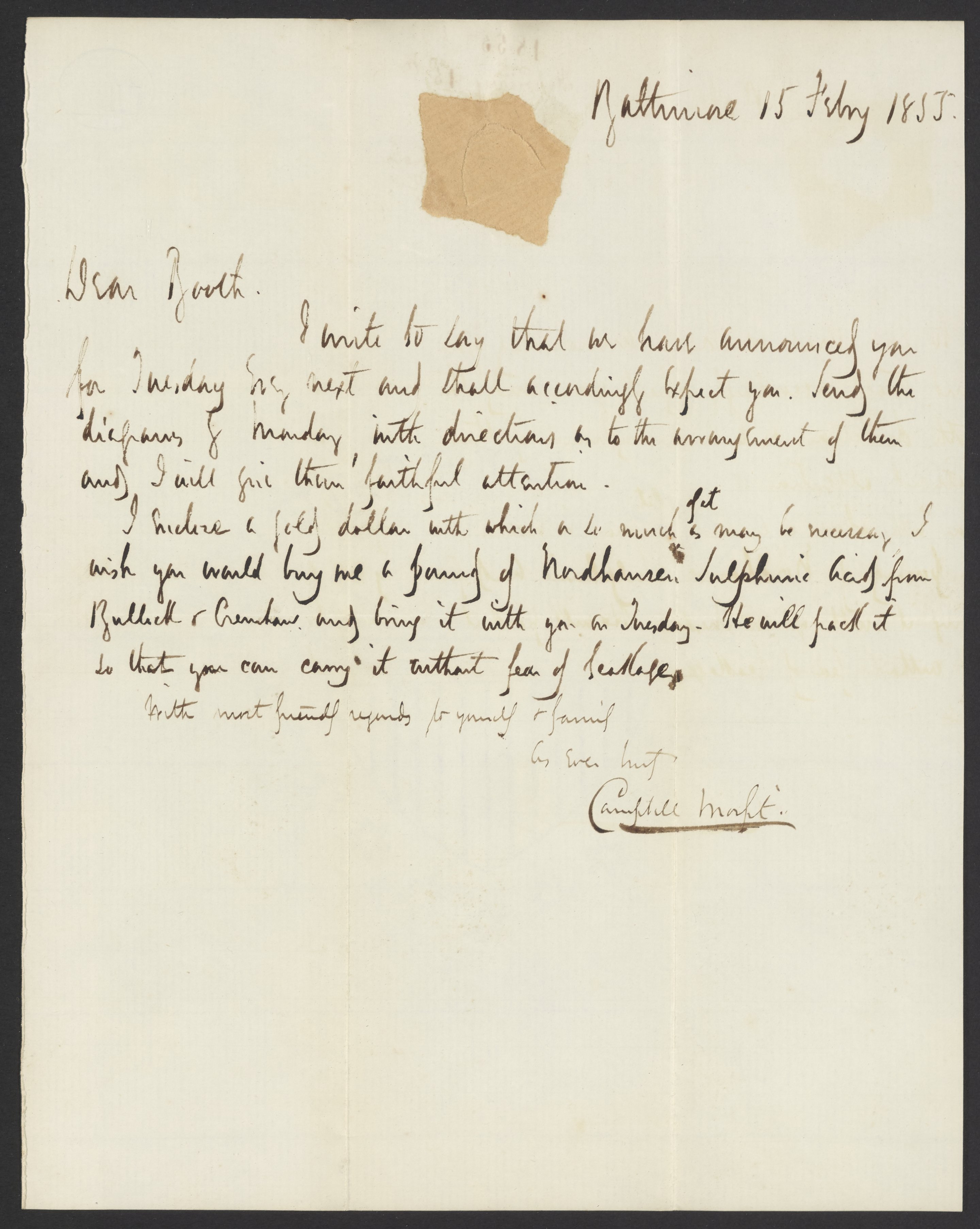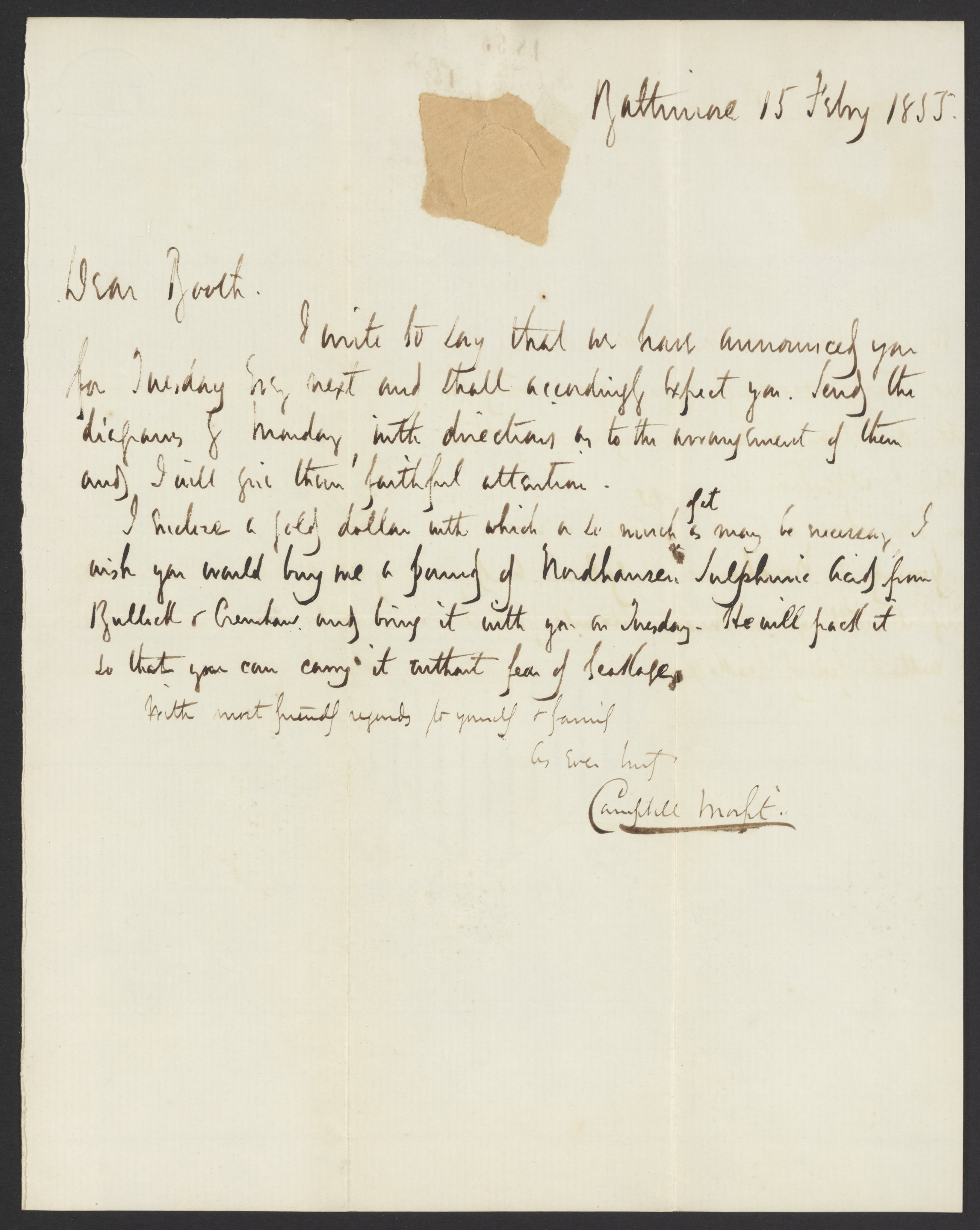 Letter from Campbell Morfit to James Curtis Booth, February 15, 1855
