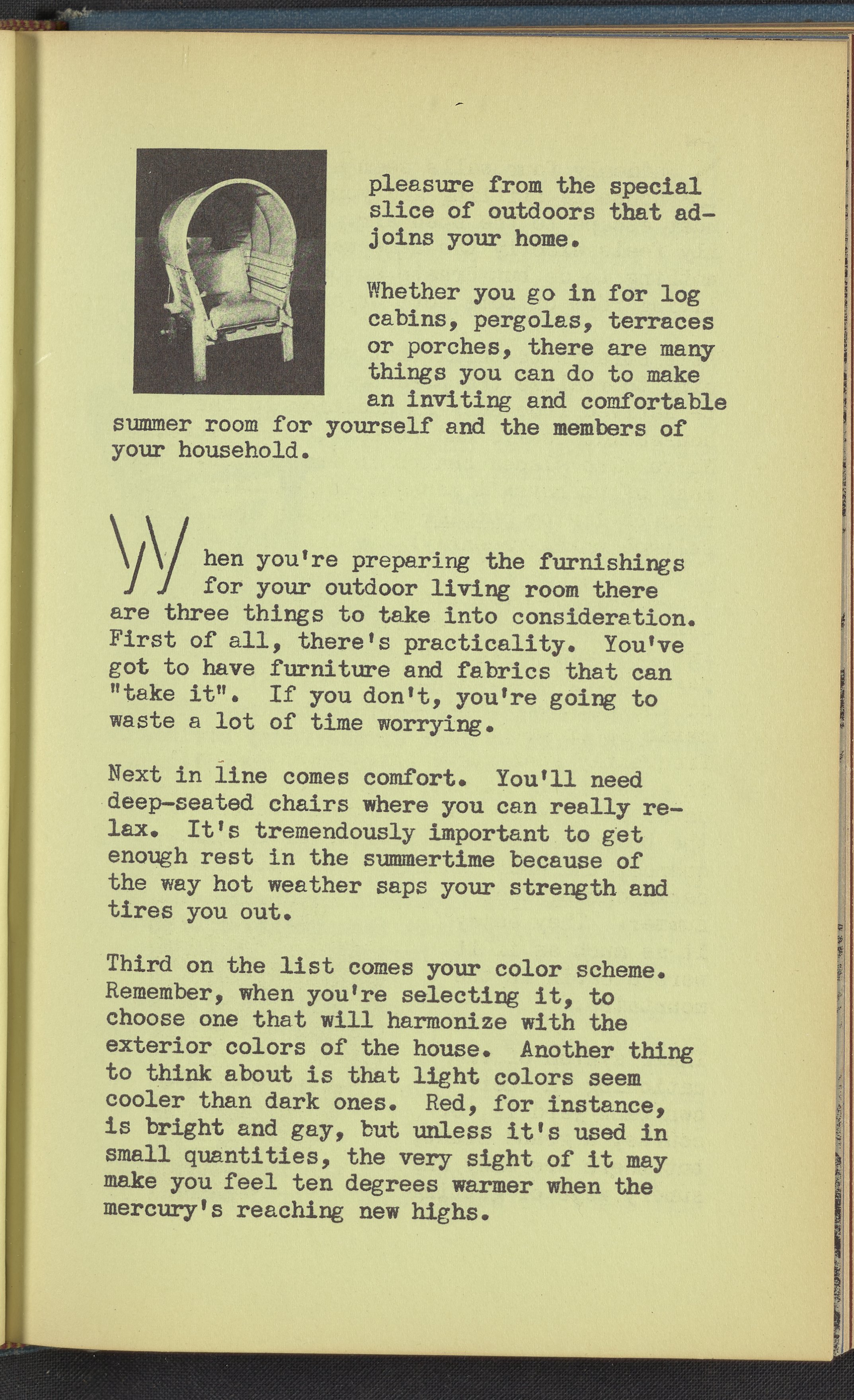 Booklet corresponding to a radio broadcast program created by the National Paint, Varnish, and Lacquer Association. The booklet describes the joy of escaping a stifling home to enjoy the outdoors by creating one's own outdoor living space. Discusses the steps necessary to create an outdoor living room including choosing furnishings and harmonizing a color scheme. Provides useful insight into the materials able to withstand the elements and what paint should be used with each. For example, metal porch furniture should be coated with a special metal primer to prevent corrosion. The booklet also provides instructions for painting furniture. Includes small stylized illustrations throughout and decorated covers.