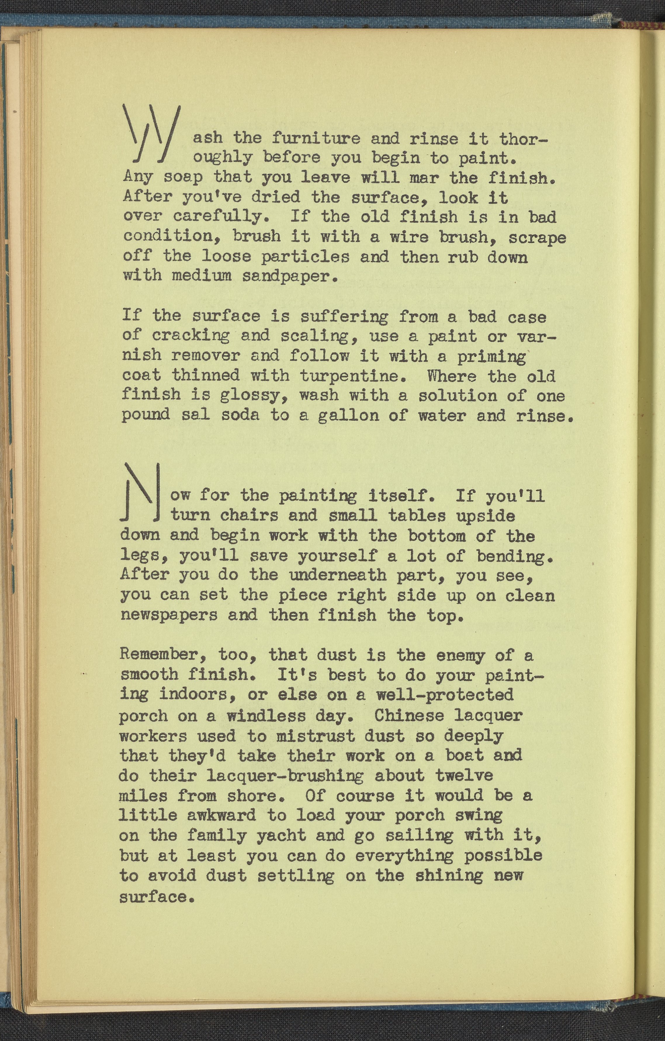 Booklet corresponding to a radio broadcast program created by the National Paint, Varnish, and Lacquer Association. The booklet describes the joy of escaping a stifling home to enjoy the outdoors by creating one's own outdoor living space. Discusses the steps necessary to create an outdoor living room including choosing furnishings and harmonizing a color scheme. Provides useful insight into the materials able to withstand the elements and what paint should be used with each. For example, metal porch furniture should be coated with a special metal primer to prevent corrosion. The booklet also provides instructions for painting furniture. Includes small stylized illustrations throughout and decorated covers.