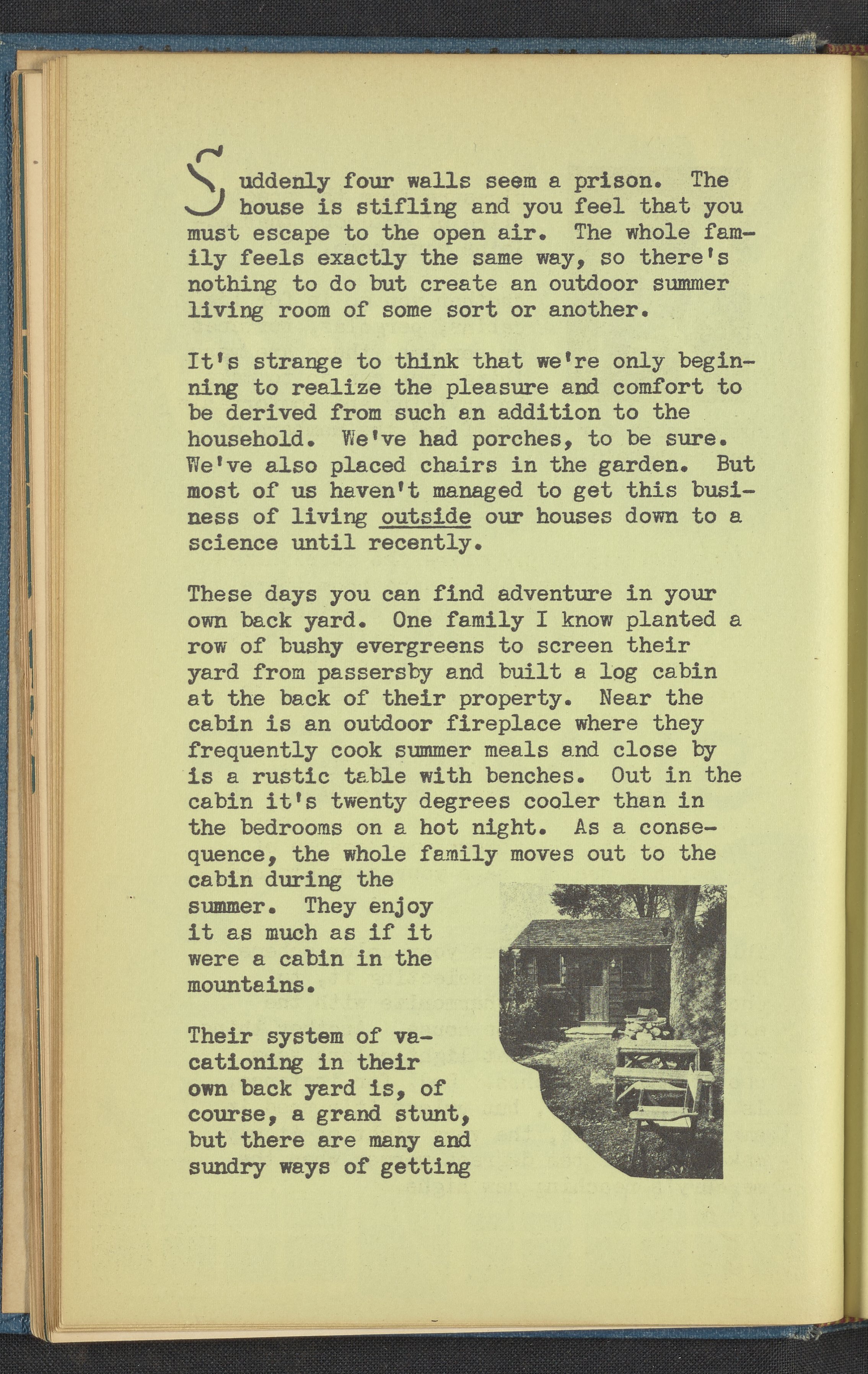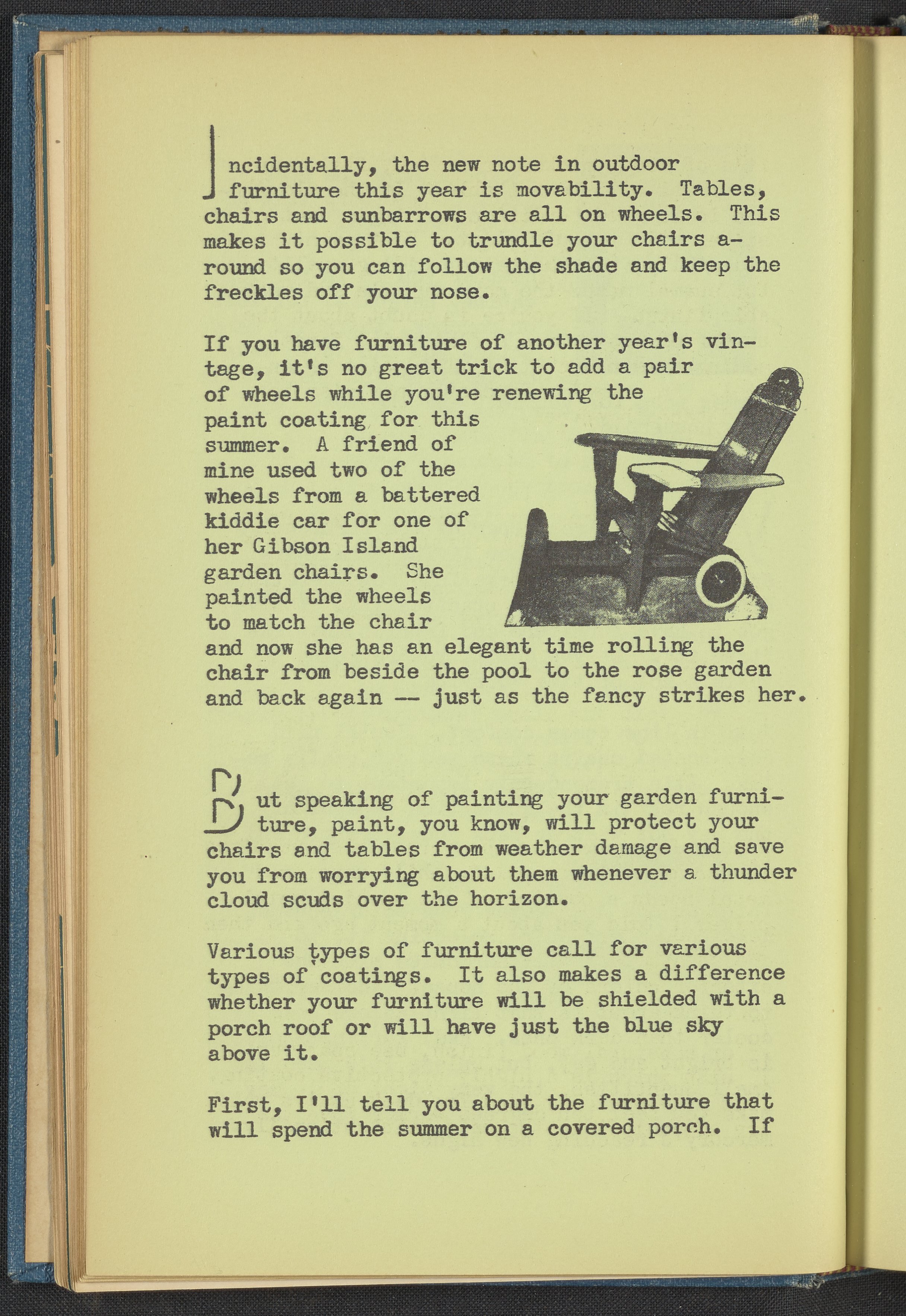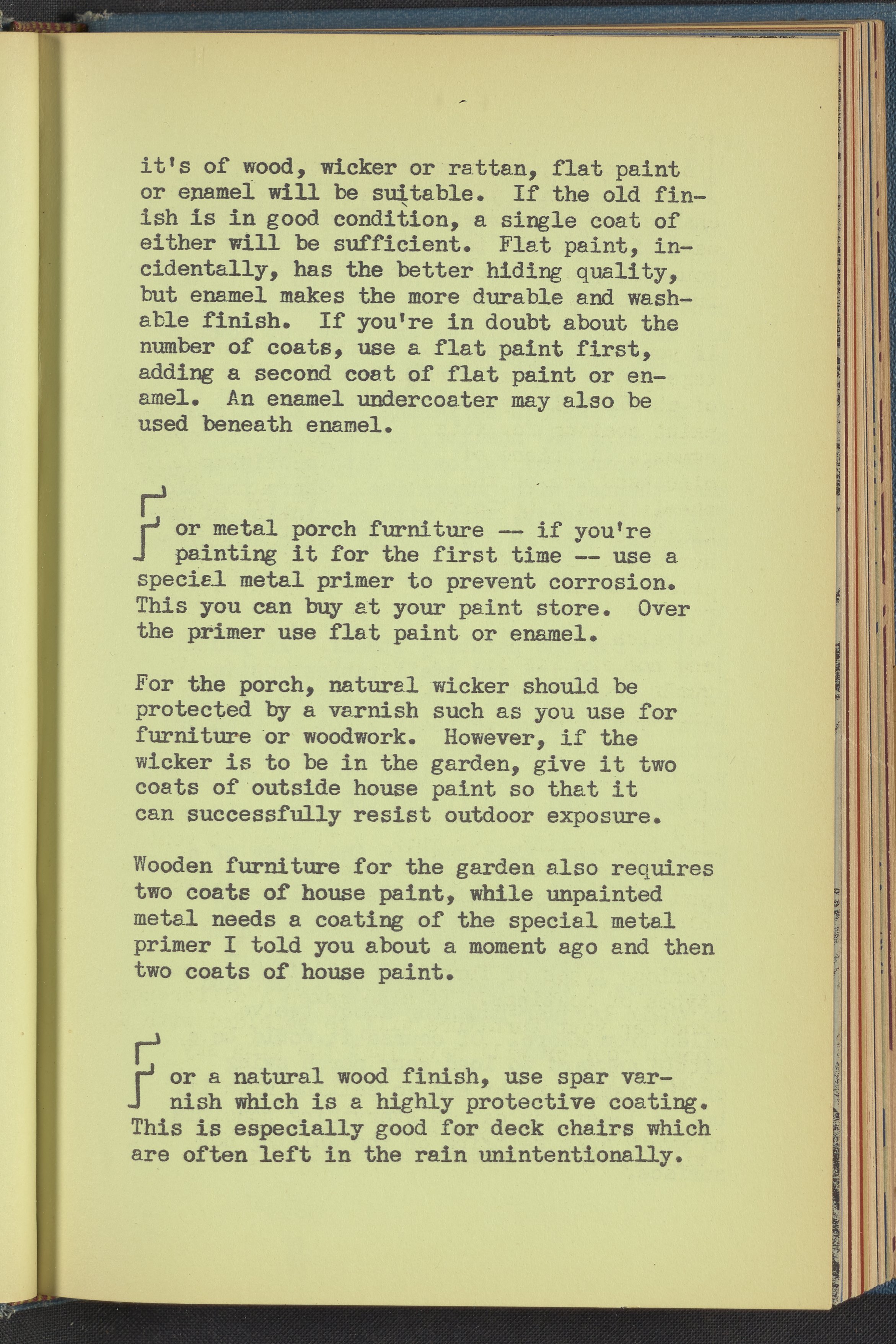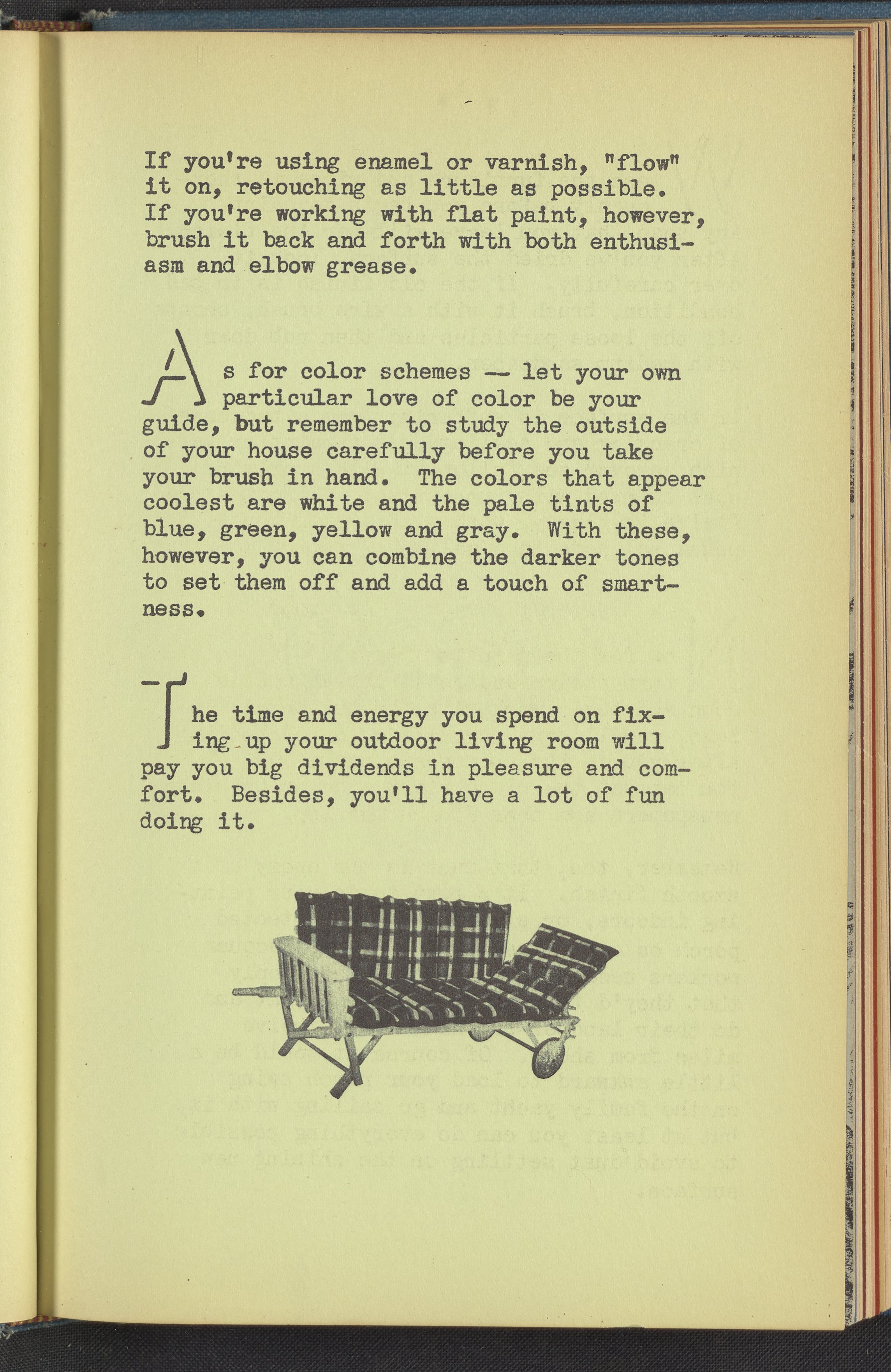 Booklet corresponding to a radio broadcast program created by the National Paint, Varnish, and Lacquer Association. The booklet describes the joy of escaping a stifling home to enjoy the outdoors by creating one's own outdoor living space. Discusses the steps necessary to create an outdoor living room including choosing furnishings and harmonizing a color scheme. Provides useful insight into the materials able to withstand the elements and what paint should be used with each. For example, metal porch furniture should be coated with a special metal primer to prevent corrosion. The booklet also provides instructions for painting furniture. Includes small stylized illustrations throughout and decorated covers.