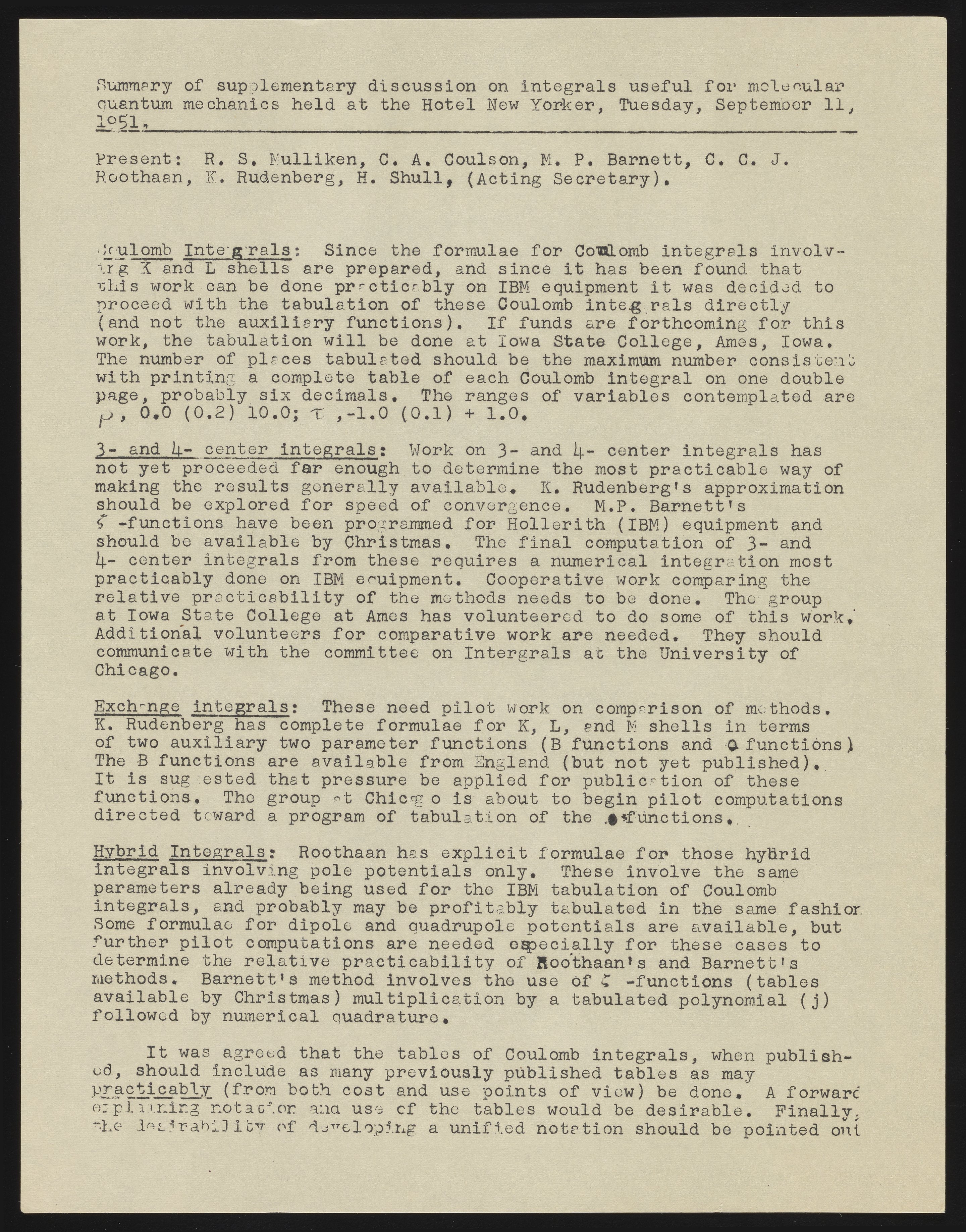 Meeting held at the Hotel New Yorker, with R.S. Mulliken, C.A. Coulson, H. Shull, M.A. Barnett, C.C.J. Roothaan and K. Rudenberg in attendance.