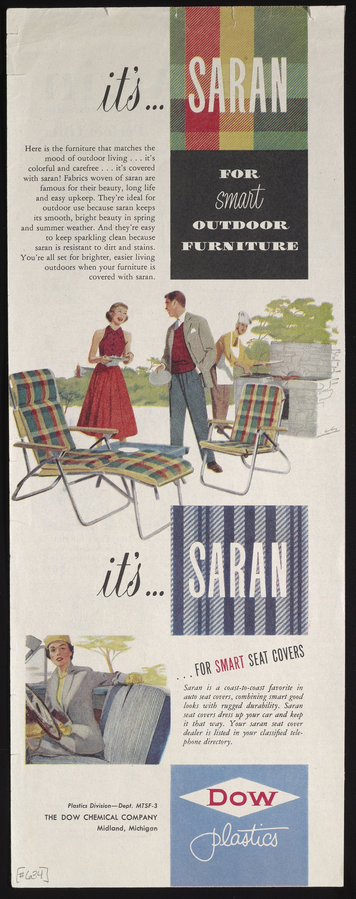 Dow Chemical Company. “It’S...SARAN...for Smart Outdoor Furniture...It’S...SARAN...for Smart Seat Covers,” 1950–1959. Advertisements from the Dow Chemical Historical Collection, Box 9. Science History Institute. Philadelphia. https://digital.sciencehistory.org/works/komldqg.