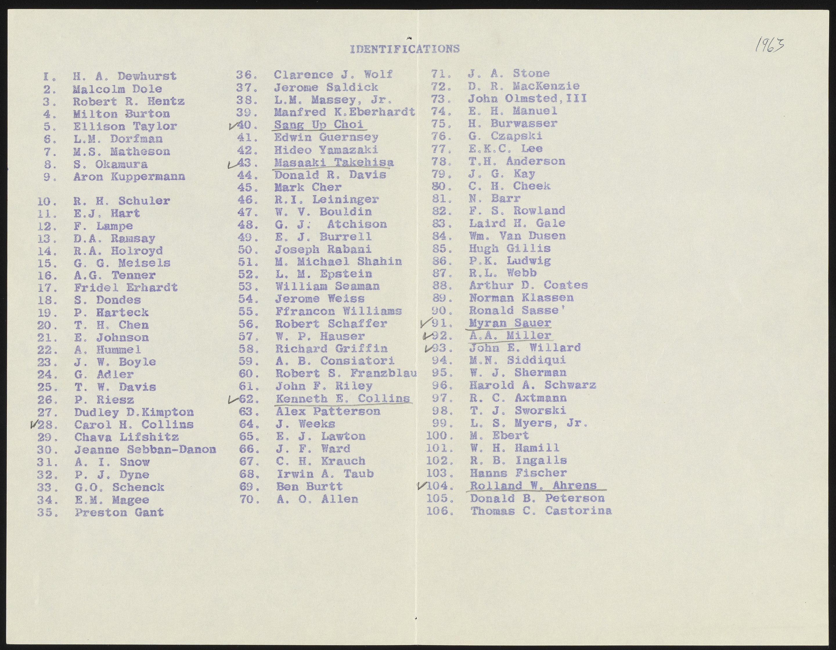 Small JPG1200 x 982px — 322 KBLarge JPG2880 x 2357px — 1.2 MBFull-sized JPG4210 x 3445px — 2.2 MBOriginal fileTIFF — 4210 x 3445px — 41.5 MBGroup photograph of attendees at the Gordon Research Conference on Radiation Chemistry held in New Hampton, New Hampshire in July 1963. Included with the photograph are a hand-drawn key and name list identifying the individuals depicted in the photo.