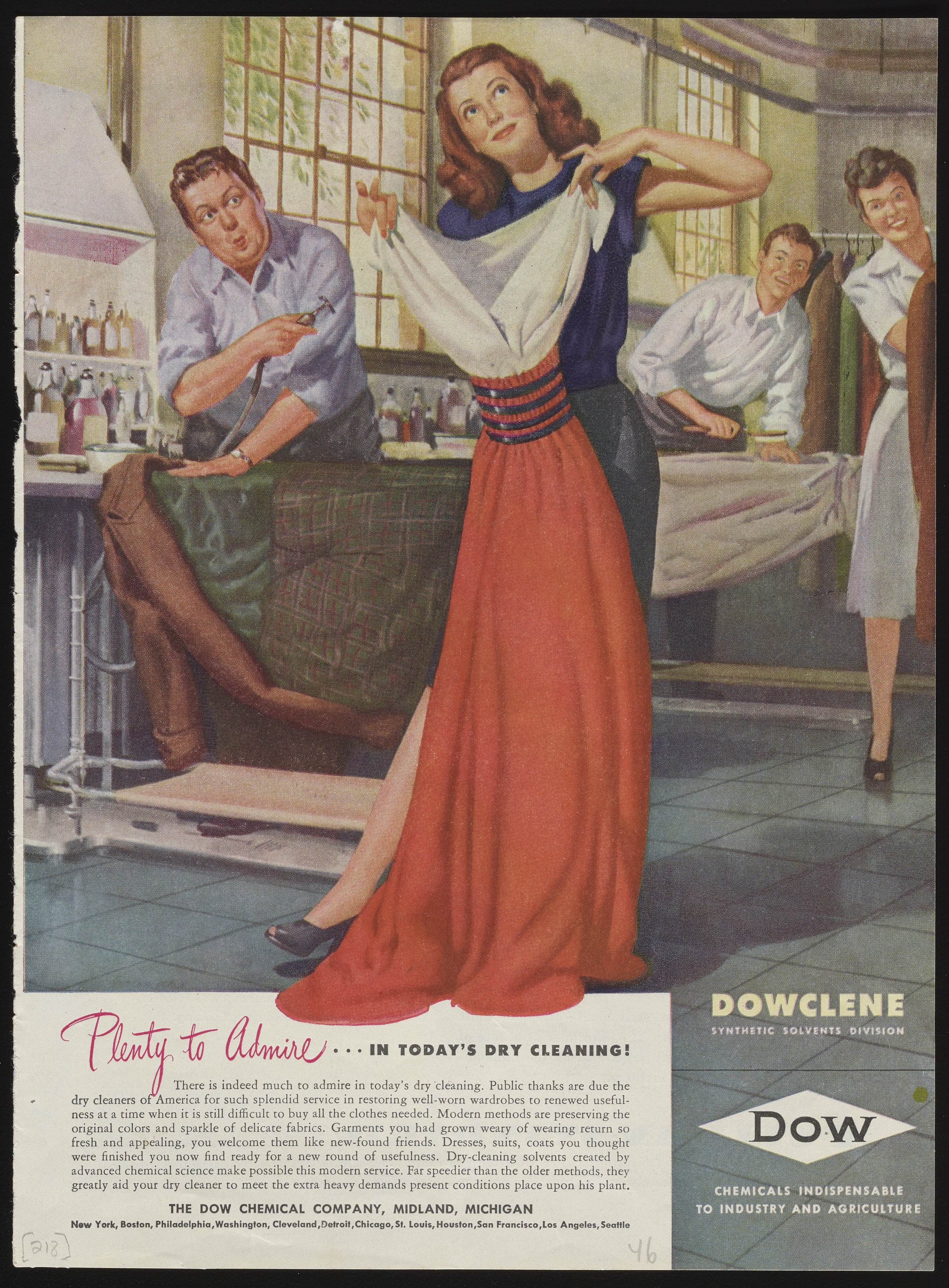 Dow Chemical Company. “Plenty to Admire...in Today's Dry Cleaning!,” 1946. Advertisements from the Dow Chemical Historical Collection, Box 7. Science History Institute. Philadelphia. https://digital.sciencehistory.org/works/kp78gh09s.
