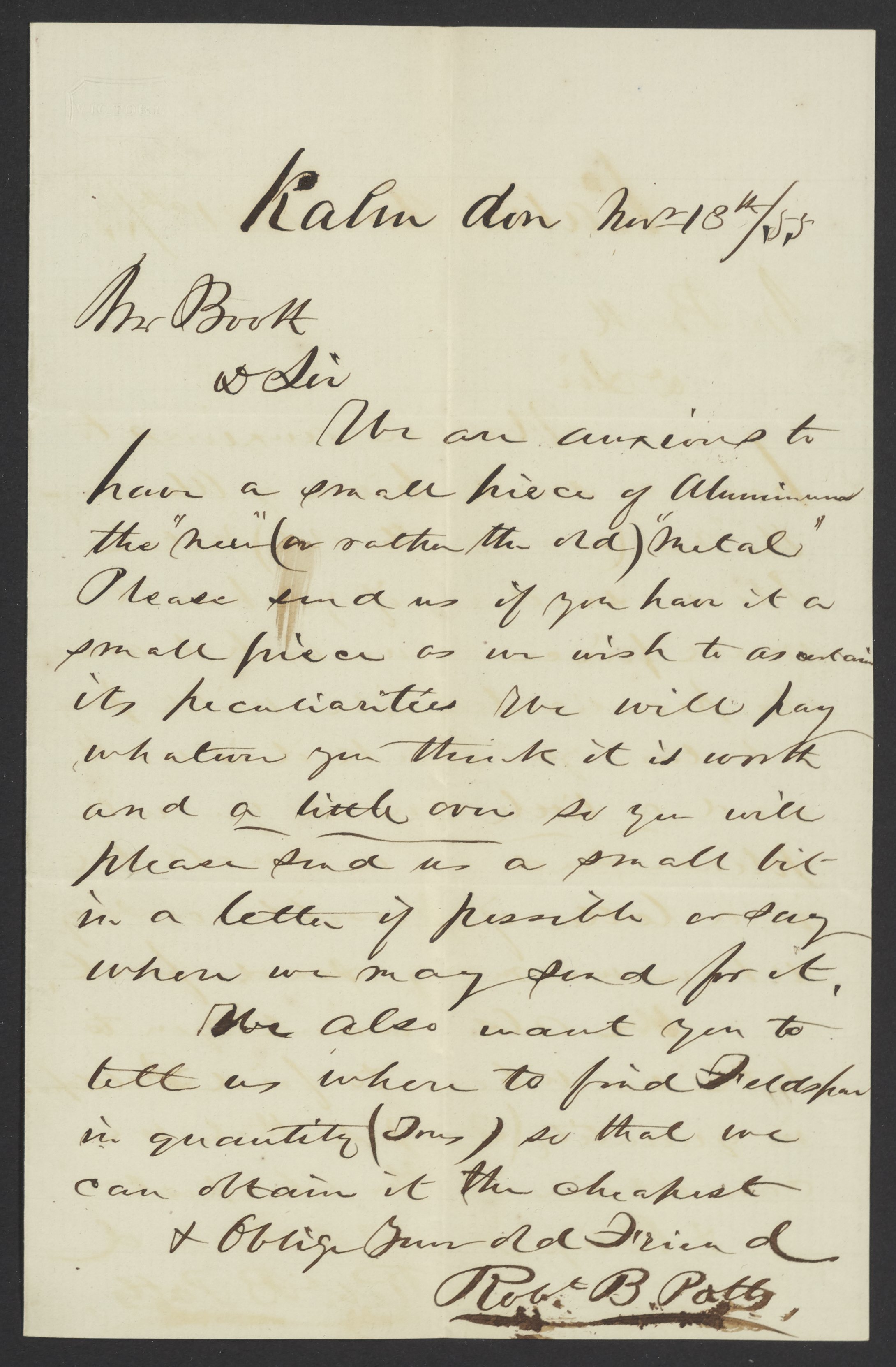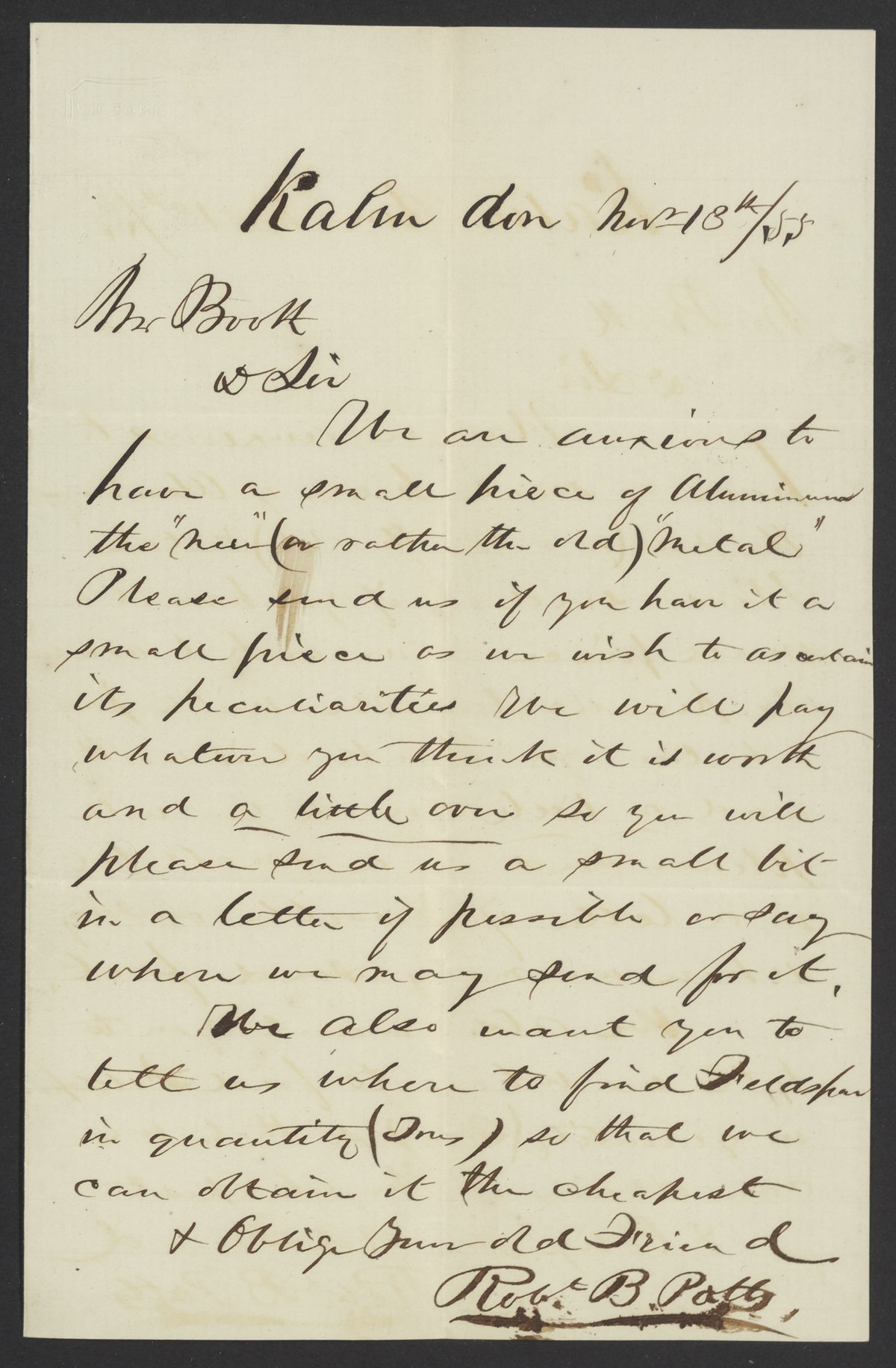 Small JPG1200 x 1830px — 278 KBFull-sized JPG2180 x 3324px — 696 KBOriginal fileTIFF — 2180 x 3324px — 20.8 MBPotts writes James Curtis Booth (1810-1888) with the desire to obtain a sample of aluminum and to locate a feldspar deposit.