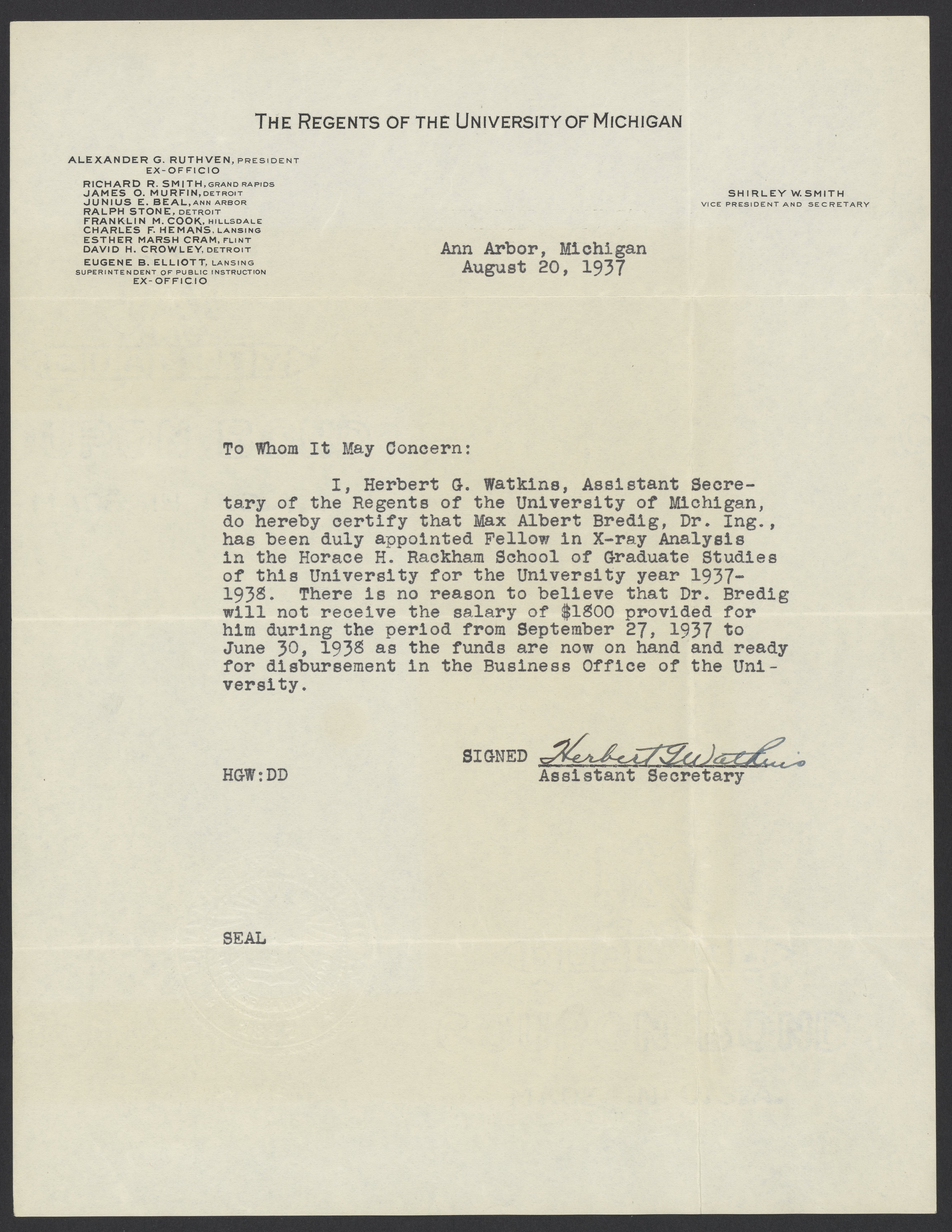 Letter certifying Max Bredig's position at the University of Michigan