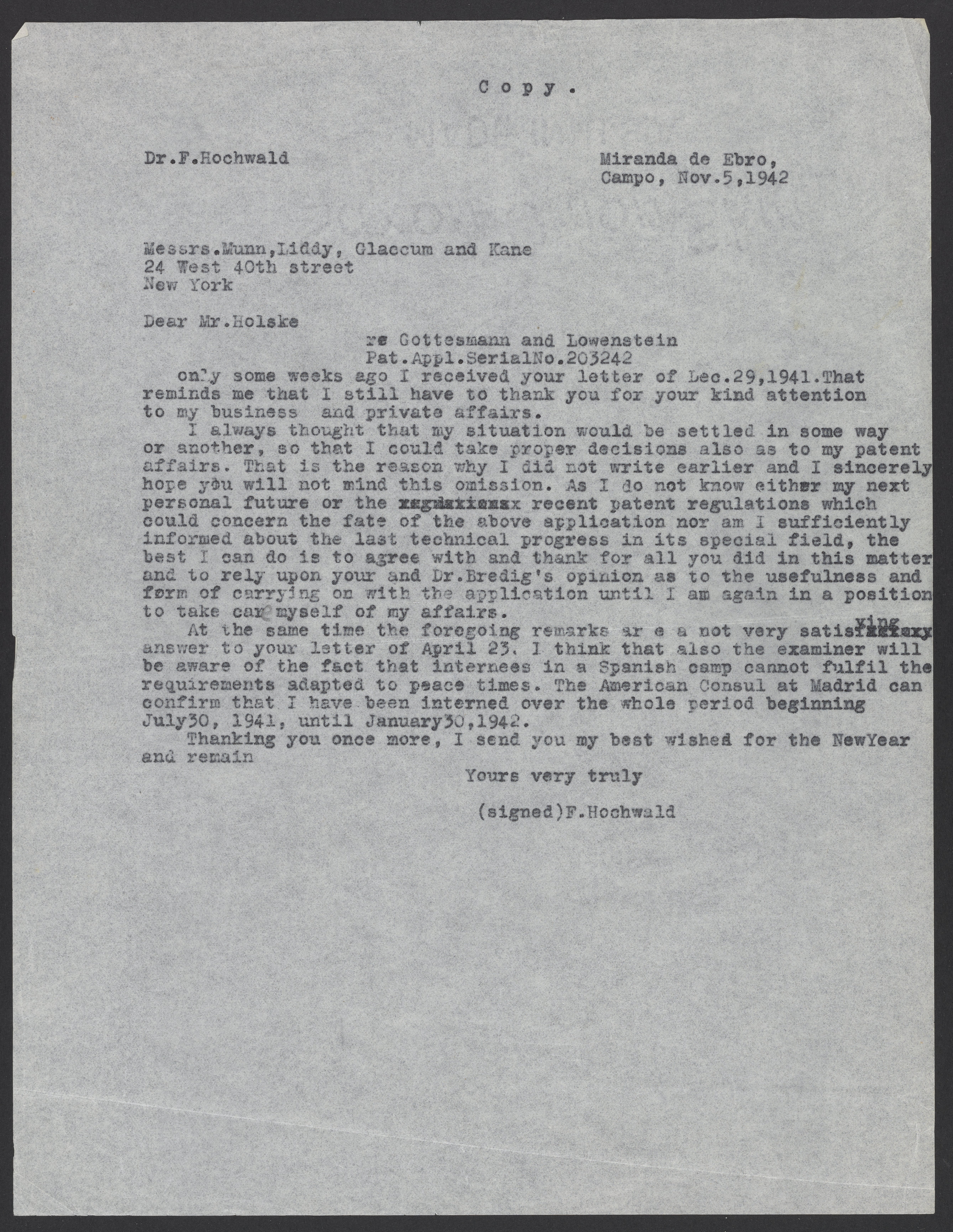 Fritz Hochwald (1897-1968) writes to Clarence. E. Holske of Munn, Liddy, Glaccum, and Kane, a New York-based law firm, regarding Hochwald's patent applications. At this time Hochwald is again detained at the Miranda de Ebro concentration camp in Burgos, Spain.