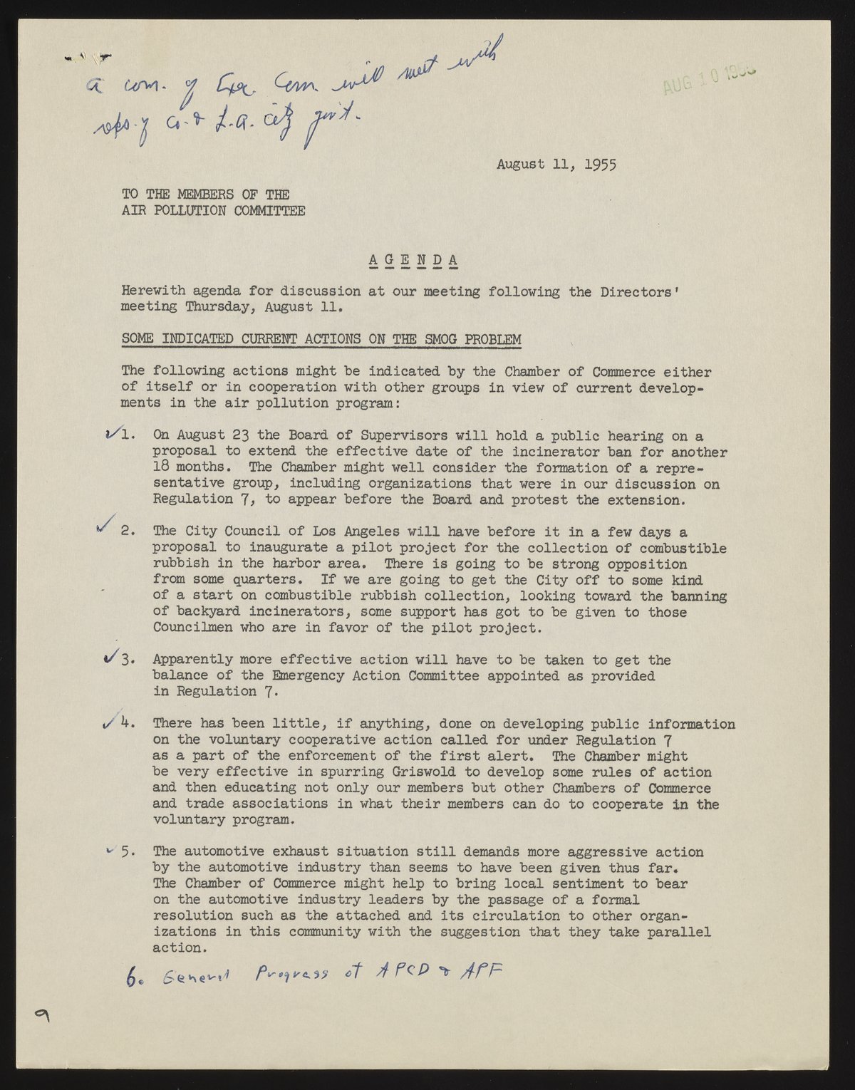 “Agenda for Meeting of the Air Pollution Committee,” August 11, 1955. Beckman Historical Collection, Box 1, Folder 30. Science History Institute. Philadelphia. https://digital.sciencehistory.org/works/ks65hd091.