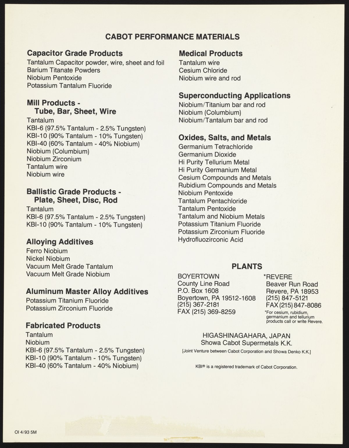 “Periodic Table of the Elements.” Boyertown, Pennsylvania: Cabot Performance Materials, 1991. Periodic Tables Collection, Box FC-5, Folder Periodic Tables (Assorted). Science History Institute. Philadelphia. https://digital.sciencehistory.org/works/ks65hd198.