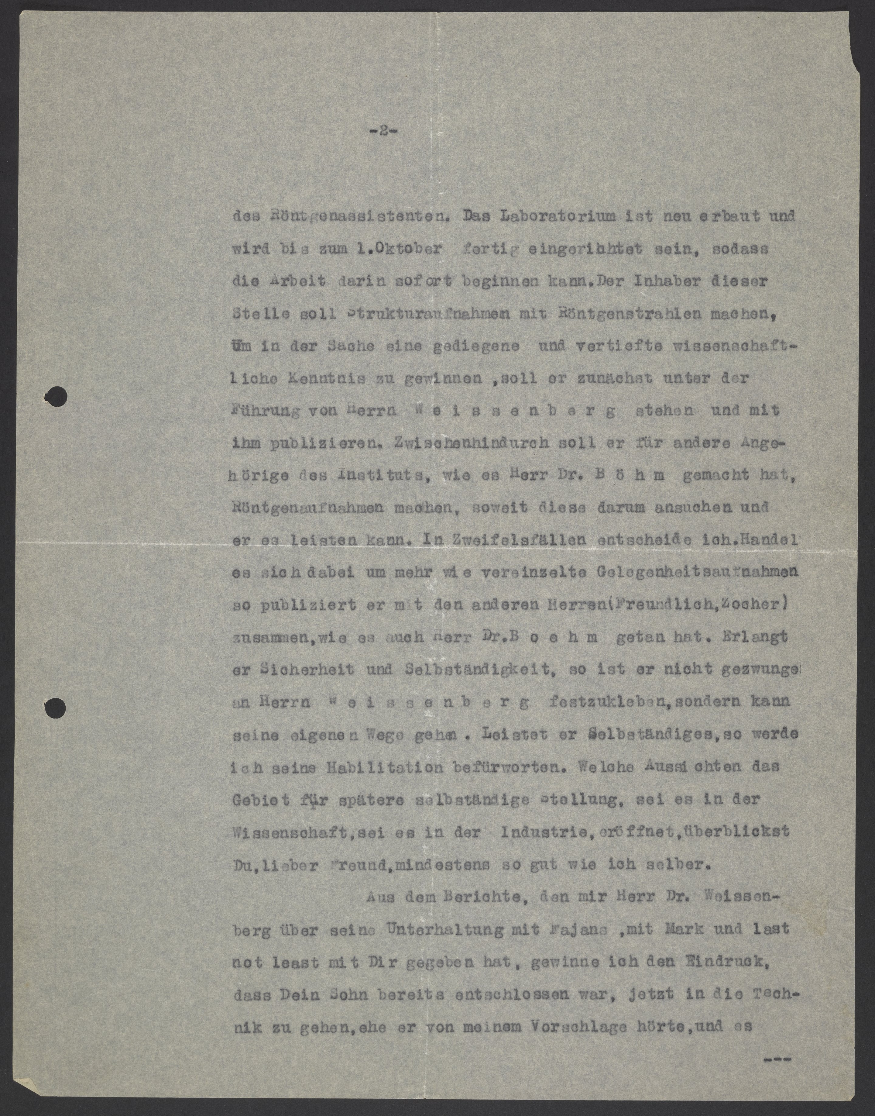 Heute schreibe ich Dir wegen Deines Sohnes. Ich habe zunächst, da ich nicht selber nach München kommen konnte, mich brieflich and Herrn Professor Fajans gewandt, um zu hören, ob er Deinen Sohn als Mitarbeiter festhält oder geneigt ist, ihn abzugeben. Herr Weissenberg, dem ich den Brief übergeben habe, berichtet mir, dass Herr Fajans nicht gegen seinen Übergang an mein Institut einwendet. Ich bin dadurch in der Lage, ihm jetzt ein Anerbieten zu machen, und ich tue es durch diesen Brief, dessen Abschrift ich ihn übersende, indem ich davon ausgehe, dass er sich nicht ohne Verständigung mit Dir wird entscheiden wollen. Ich habe hier eine Stelle am 1. Oktober zu besetzen. Ich biete sie Deinem Sohne mit einem Anfangsgehalte von Mk. 300., - Auszahlung und mit der Massgabe an, dass sie bei der Bewährung mit einem Vollassistentengehalte versehen wird. Er untersteht in dieser Stelle mir unmittelbar und ausschliesslich. Die Aufgabe der Stelle sind dieselben, die früher Herr Dr. J. Boehm gehabt hat., seit dessen Abgang nach Duisburg sie nicht mehr besetzt worden ist. Es ist die Stelle des