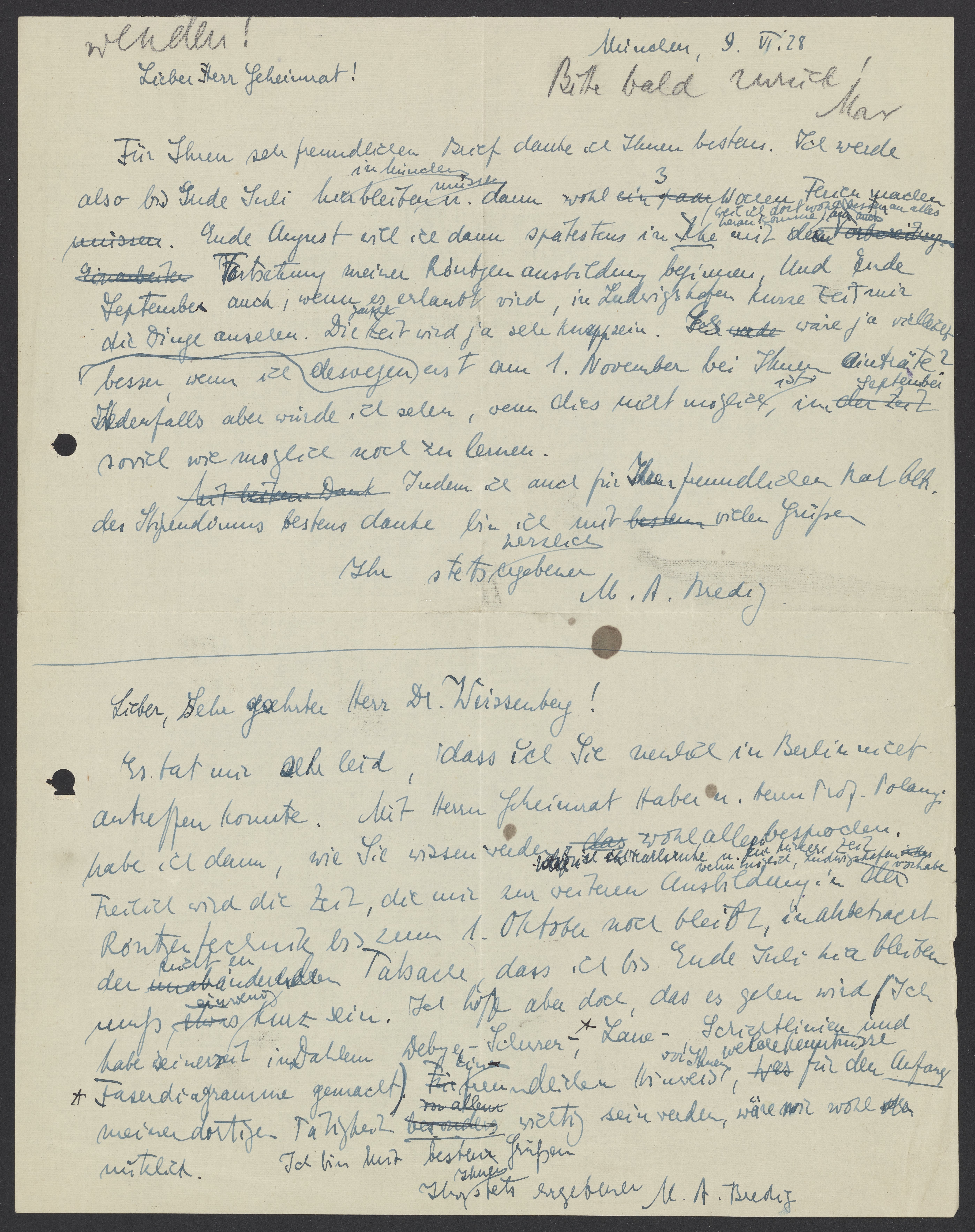 Letters from Max Bredig to Fritz Haber and Karl Weissenberg, June 1928