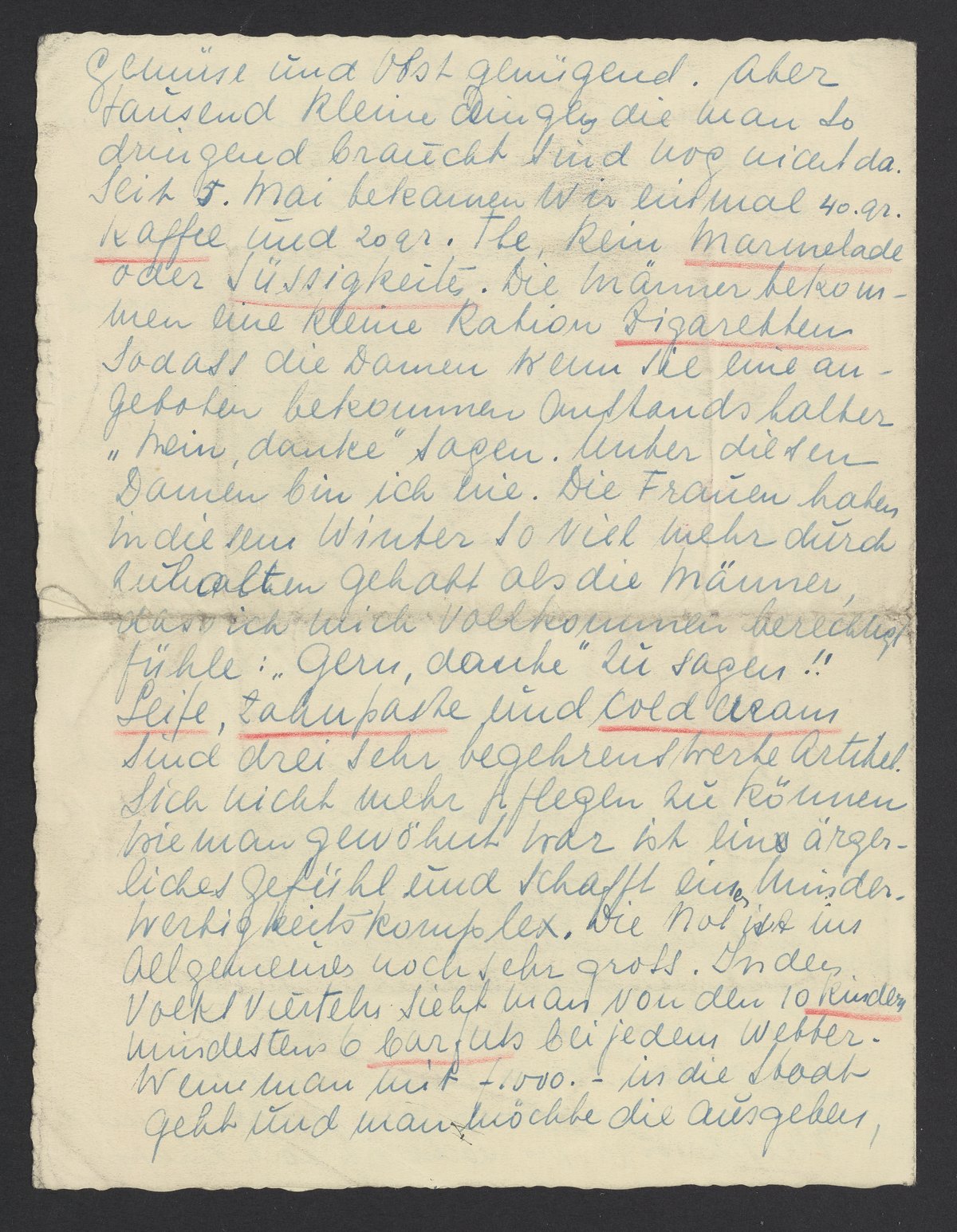 Gemüse und Obst genügen. Aber tausend kleine Dinge, die man so dringt braucht sind noch nicht da. Seit 5. Mai bekamen wir einmal 40. gr. Kaffee und 20 gr. Tee, kein Marmelade oder Süssigkeiten. Die Männer bekommen eine klein Ration Zigaretten sodass die Damen wenn sie eine angehoben bekommen Anstandshalber „nein, danken“ sagen. Unter diesen Damen bin ich eine. Die Frauen haben in diesem Winter so viel mehr durchzuhalten gehabt als die Maenner, dass ich mich vollkommen berechtigt fühle: „gern, danke“ zu sagen!!