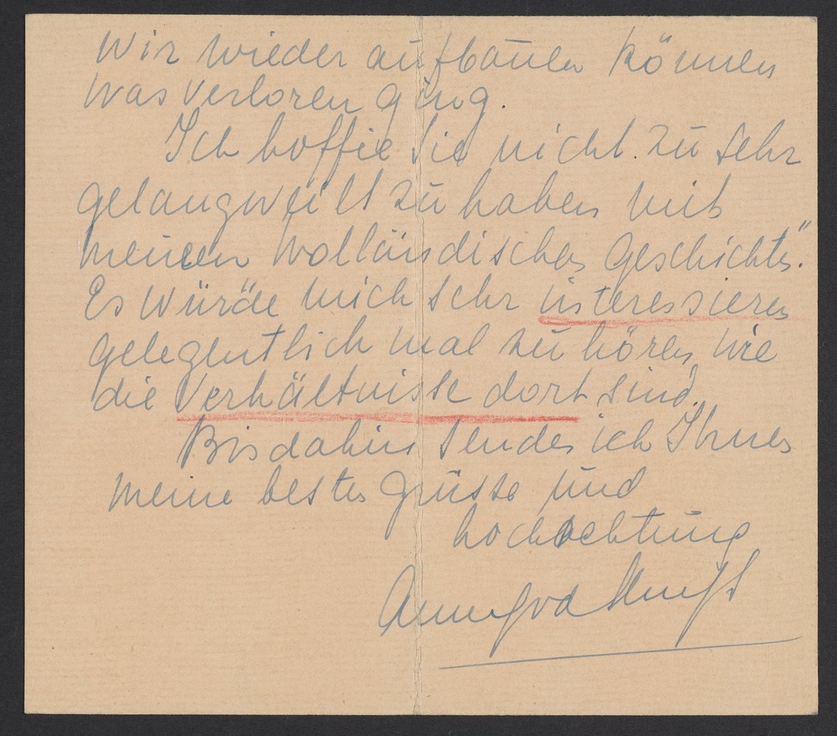 Es ist sehr lieb von Ihnen ein Paket schicken zu wollen. Meine jüdischen Freunde hier bekommen viele Pakete von England und Amerika und ich finde es jedesmal ein Wunder zu sehen was es auf der Welt noch gibt an guten und praktischen Sachen. Sie glauben nicht wie wir in jeder Beziehung arm geworden sind. Ich war gewöhnt viel zu reisen vor dem Kriege, bin 6 Wochen vor dem Einmarsch der Deutschen hier aus Niederländisch Indien zurückzukommen, wo ich ein halbes Jahr war bei vielen Verwandten und Bekannten, die ich dort habe. Der Krieg war also für mich doppelt schwer, man fühlte sich wie im Käfig. In den ersten Jahren konnte man sich einiges ersetzen durch lesen, aber später gab es nicht mal ein gutes Buch mehr. Der letzte Winter war scheusslich: kein Essen, kein Kaffee