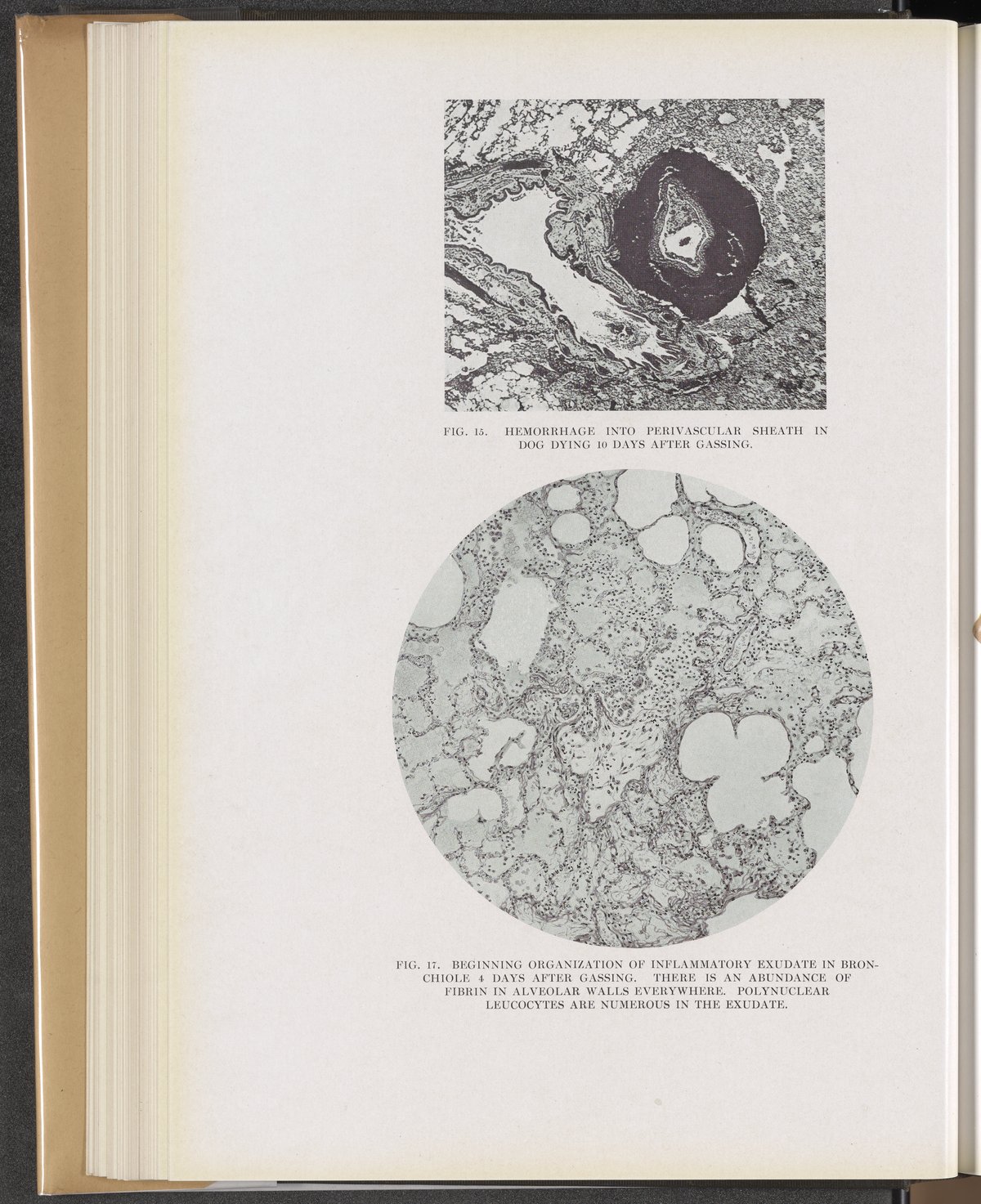 Winternitz, M. C. (Milton C.). “Fig. 15: Hemorrhage into Perivascular Sheath in Dog Dying 10 Days after Gassing. Fig. 17: Beginning Organization of Inflammatory Exudate in Bronchiole 4 Days after Gassing.” Collected Studies on the Pathology of War Gas Poisoning. New Haven, Connecticut: Yale University Press, 1920. https://digital.sciencehistory.org/works/kw52j8202.