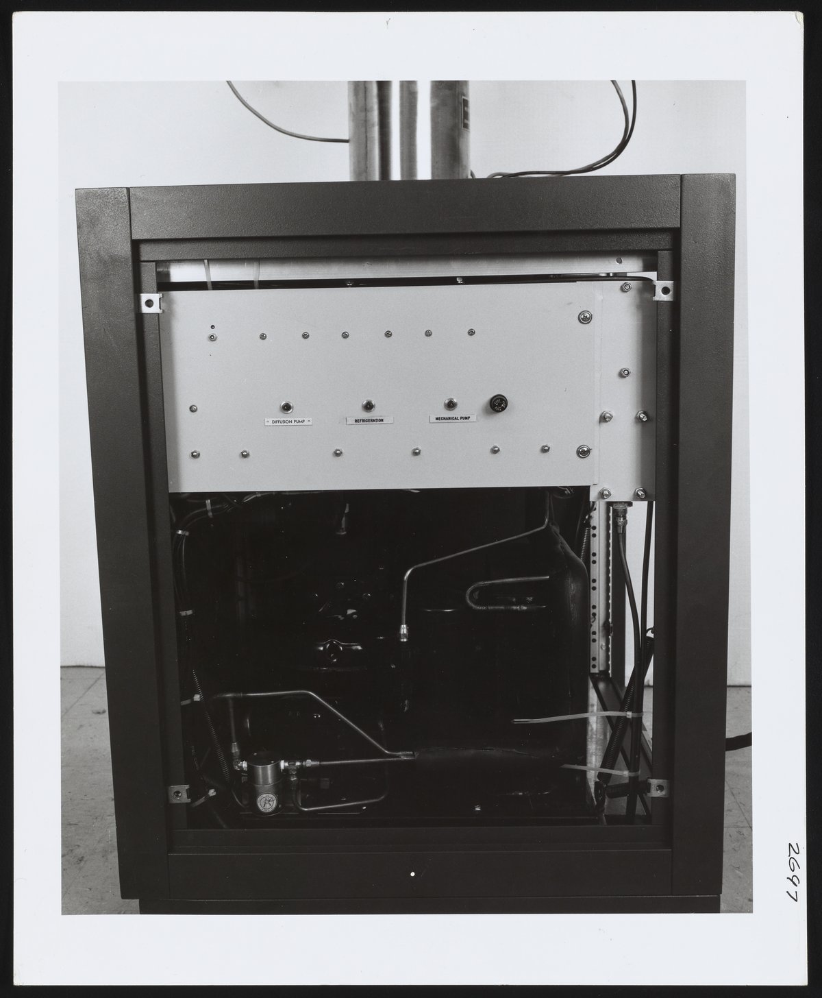 Small JPG1200 x 1466px — 257 KBLarge JPG2880 x 3518px — 1.2 MBFull-sized JPG3468 x 4236px — 1.7 MBOriginal fileTIFF — 3468 x 4236px — 42.1 MBThree general views of the exposed interior of a component unit of the Bendix Corporation Time-of-Flight Mass Spectrometer system, with view of assorted vacuum pumps and attachments. The Time-of-Flight Mass Spectrometer (TOFMS) was the flagship analytical instrument of the Bendix Corporation.