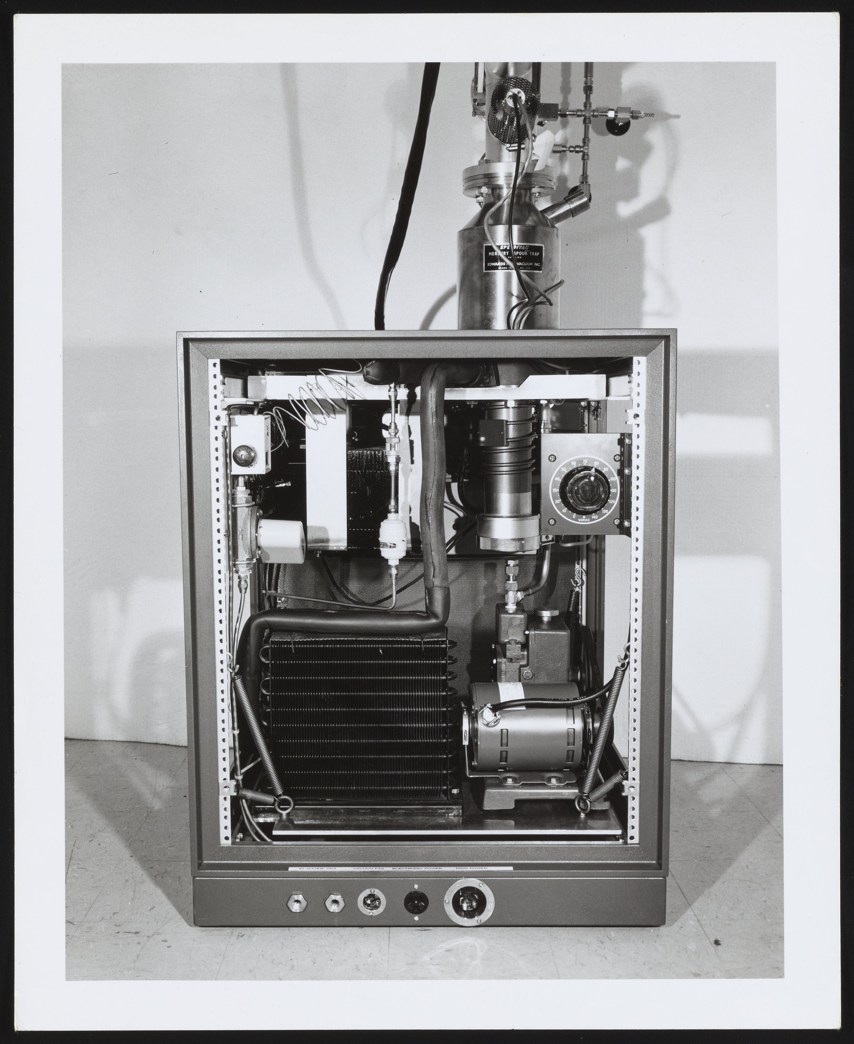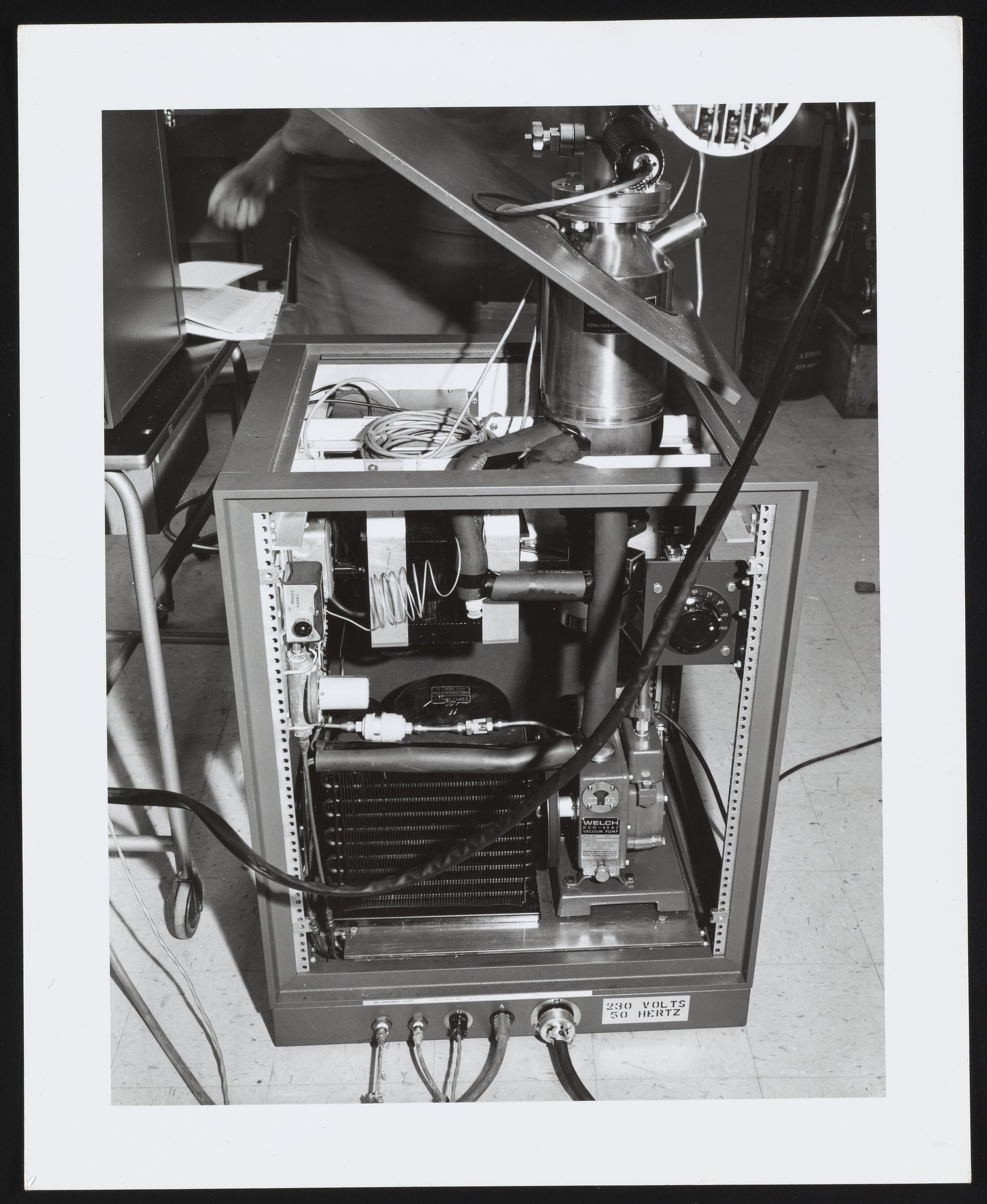 Small JPG1200 x 1466px — 257 KBLarge JPG2880 x 3518px — 1.2 MBFull-sized JPG3468 x 4236px — 1.7 MBOriginal fileTIFF — 3468 x 4236px — 42.1 MBThree general views of the exposed interior of a component unit of the Bendix Corporation Time-of-Flight Mass Spectrometer system, with view of assorted vacuum pumps and attachments. The Time-of-Flight Mass Spectrometer (TOFMS) was the flagship analytical instrument of the Bendix Corporation.