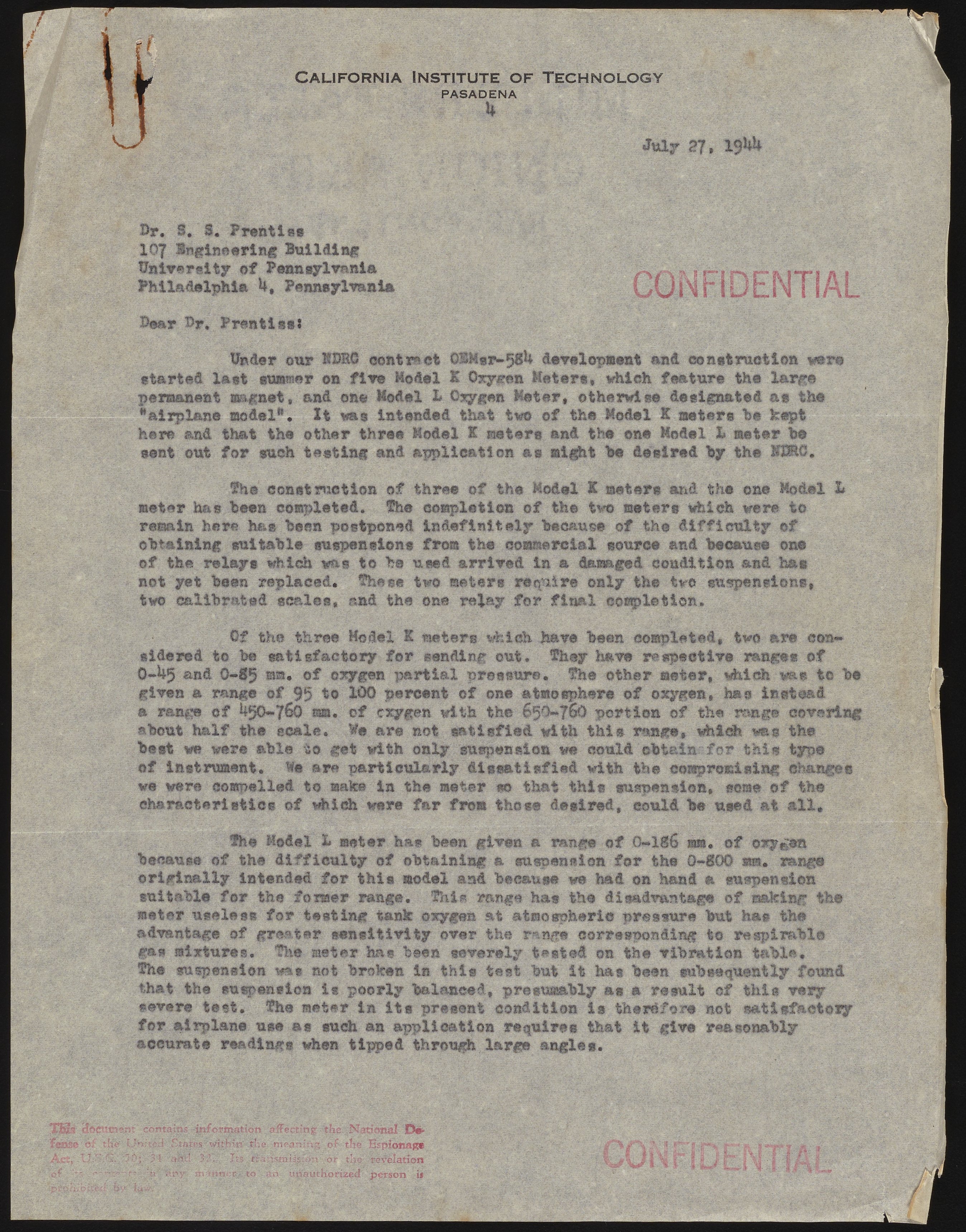 Small JPG1200 x 1530px — 409 KBFull-sized JPG2696 x 3438px — 1.9 MBOriginal fileTIFF — 2696 x 3438px — 26.6 MBThe letter regards the development of Models K and L oxygen meters, recommendations for which are ready for further testing by the National Defense Research Committee, and a note that some are unsuitable due to suspension issues.
