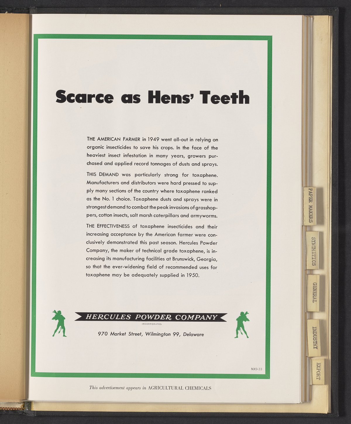 Hercules Incorporated. “Scarce as Hens' Teeth.” 1949 Hercules Advertisements, 1949. Records of Hercules Incorporated, Volume 1949. Science History Institute. Philadelphia. https://digital.sciencehistory.org/works/kw52j8890.