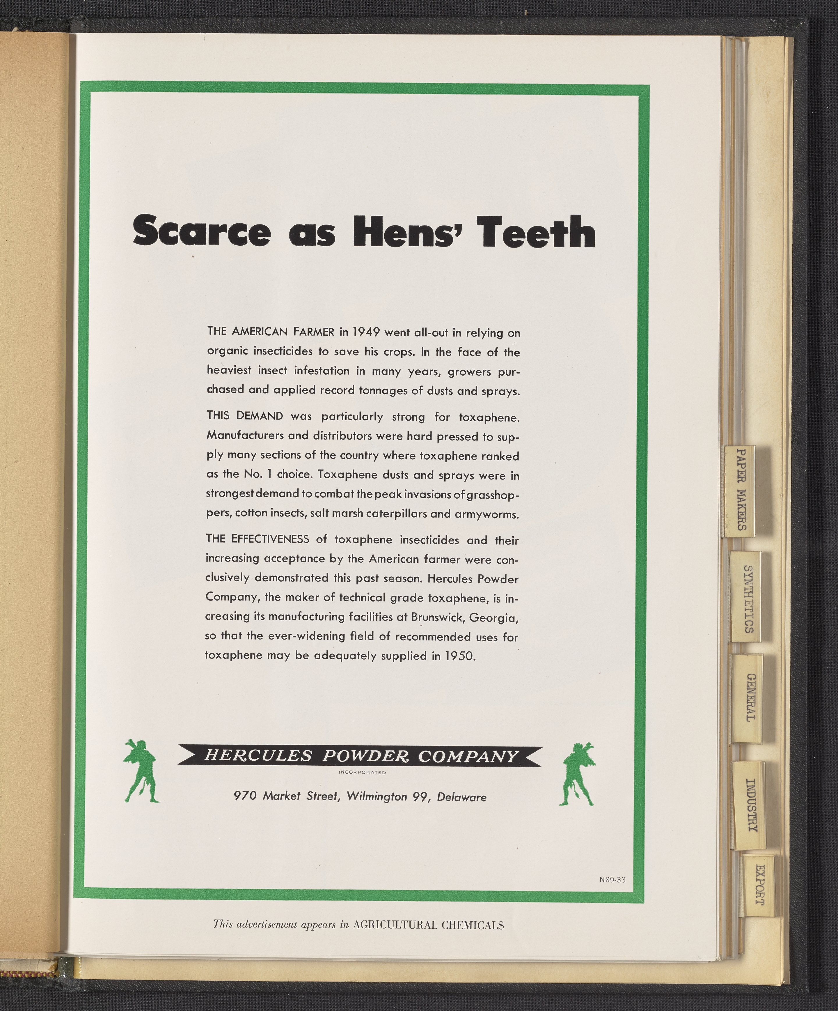 Hercules Incorporated. “Scarce as Hens' Teeth.” 1949 Hercules Advertisements, 1949. Records of Hercules Incorporated, Volume 1949. Science History Institute. Philadelphia. https://digital.sciencehistory.org/works/kw52j8890.