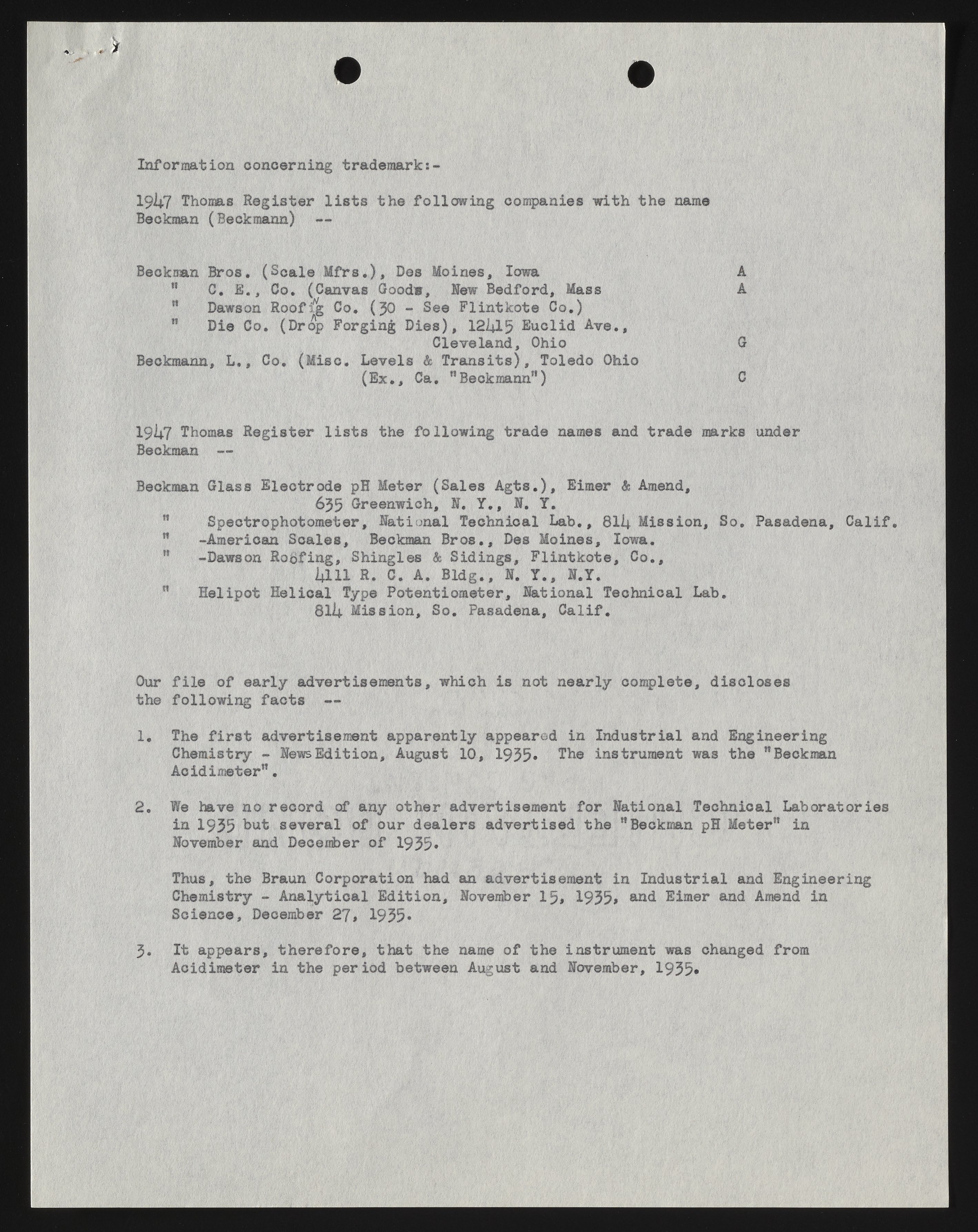 Small JPG1200 x 1536px — 250 KBFull-sized JPG2804 x 3588px — 1.4 MBOriginal fileTIFF — 2804 x 3588px — 28.8 MBThis letter includes a report on existing Beckman trademarks as of 1947, including information on the "acidimeter" and the point at which that instrument became known as the pH meter (1935).