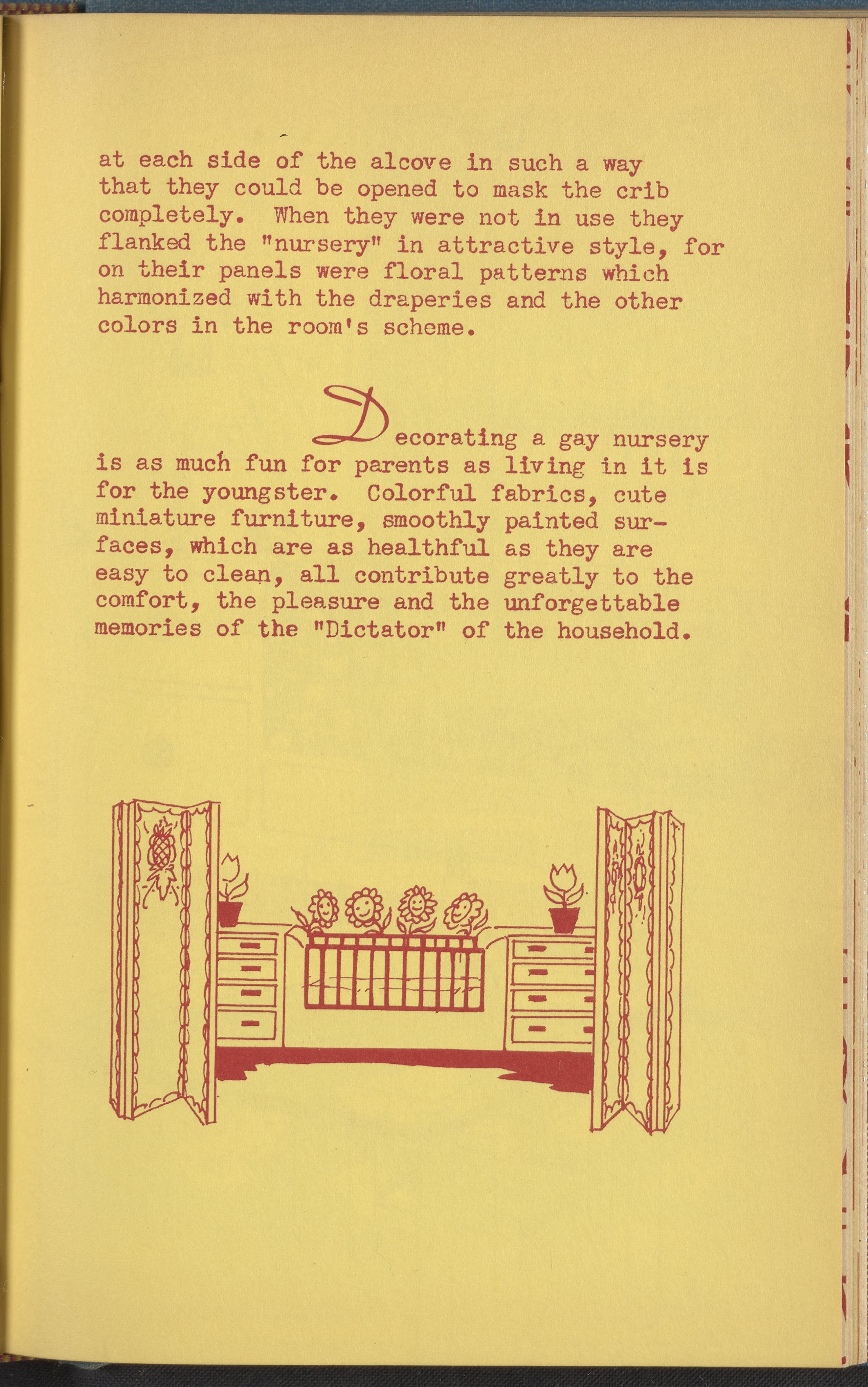 Booklet corresponding to a radio broadcast program created by the National Paint, Varnish, and Lacquer Association. The booklet provides instruction for decorating a child's nursery. Describes how young children prefer rooms decorated with primary color schemes, and describes several nurseries for inspiration. Includes small stylized illustrations throughout and decorated covers.