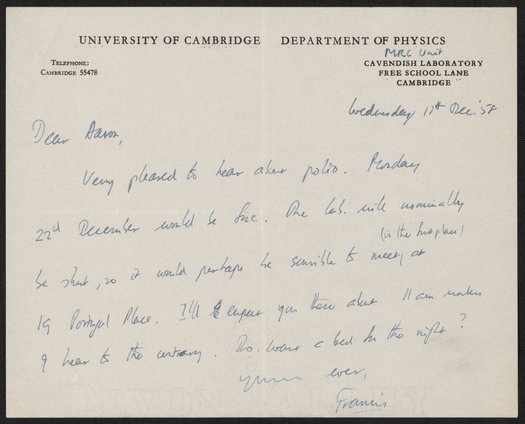 Crick, Francis. “Letter from Francis Crick to Aaron Klug, December 17, 1958,” December 17, 1958. History of Molecular Biology Collection, Box 19, Folder 17. Science History Institute. Philadelphia. https://digital.sciencehistory.org/works/kylni0l.