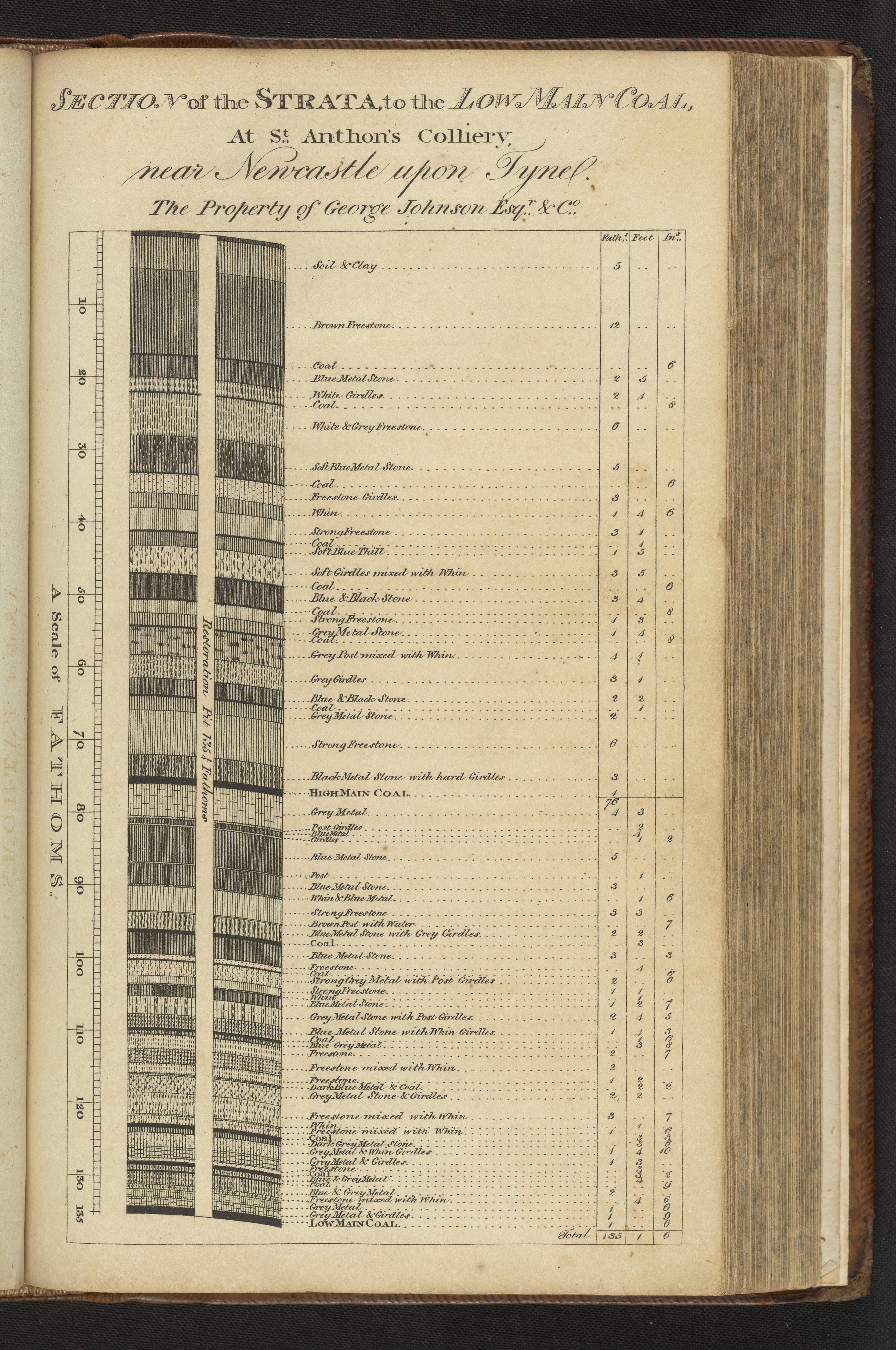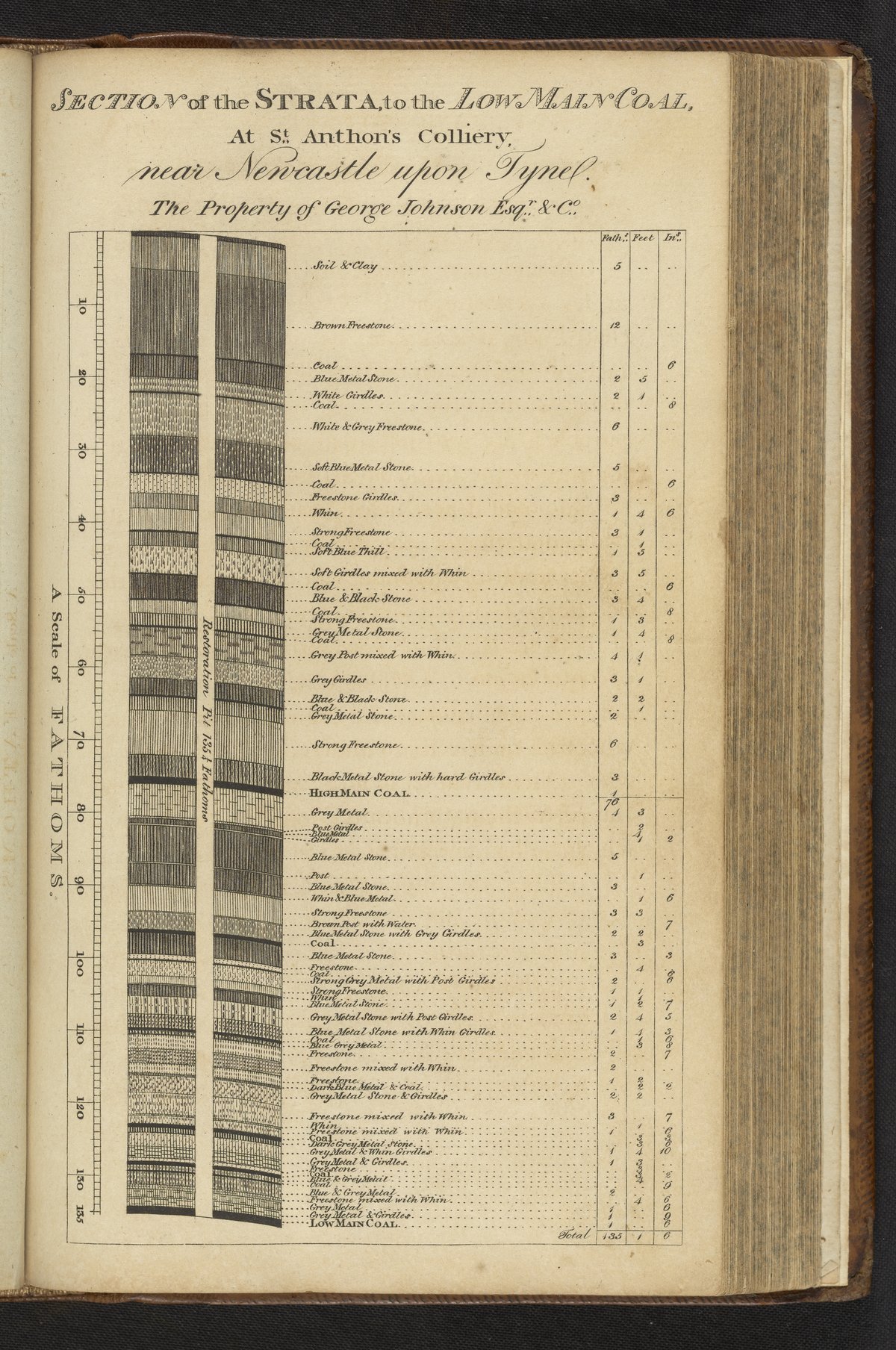 This plate depicts a section of the strata to the low main coal at St. Anthon's Colliery near Newcastle upon Tyne. The left-hand side of the graph shows a ruler denoting the different layers on a scale of fathoms. A fathom equates to around 6 feet or 2 yards. The right-hand side of the graph shows more specific measurements of some of the layers in terms of fathoms, feet, and inches.