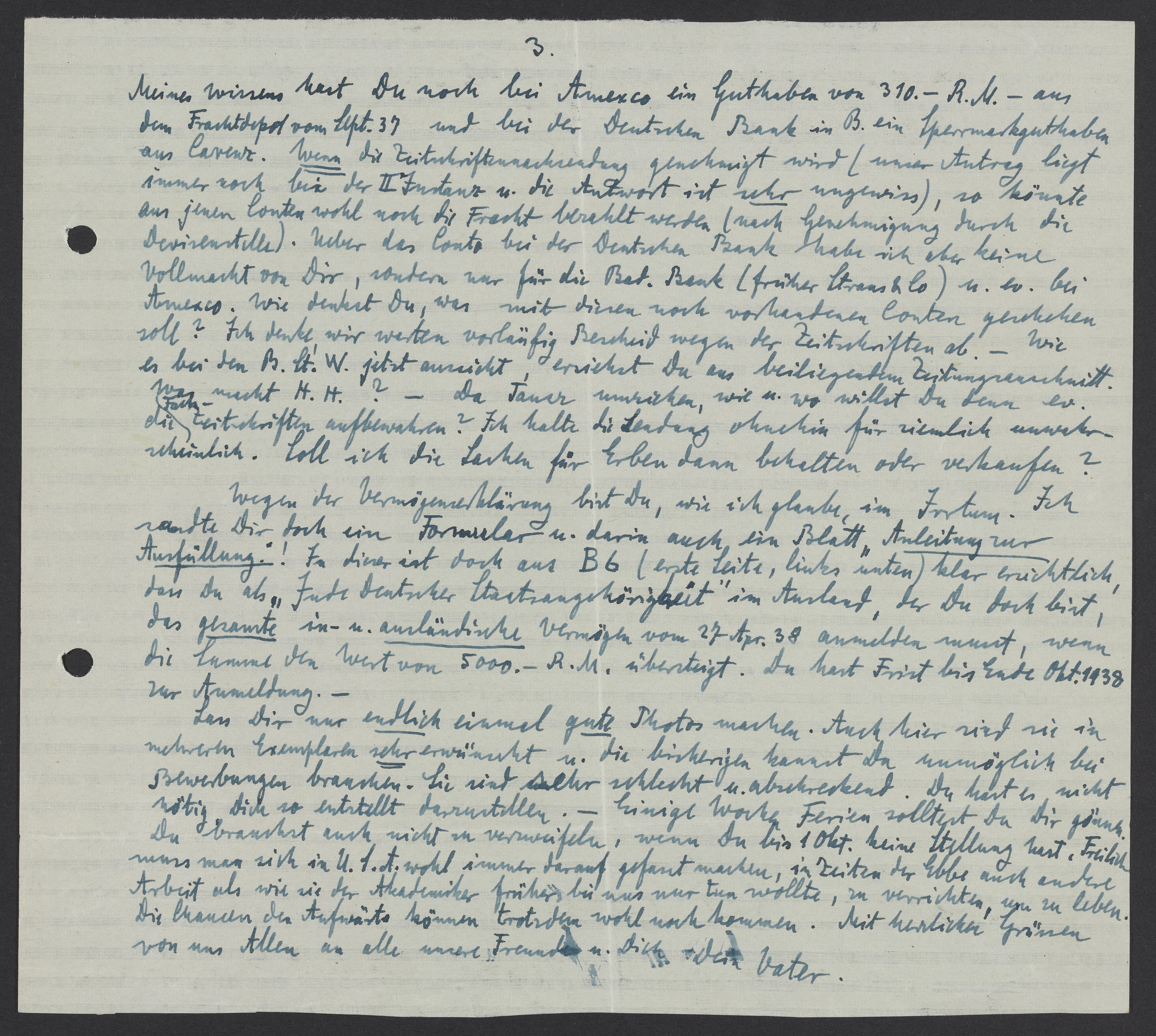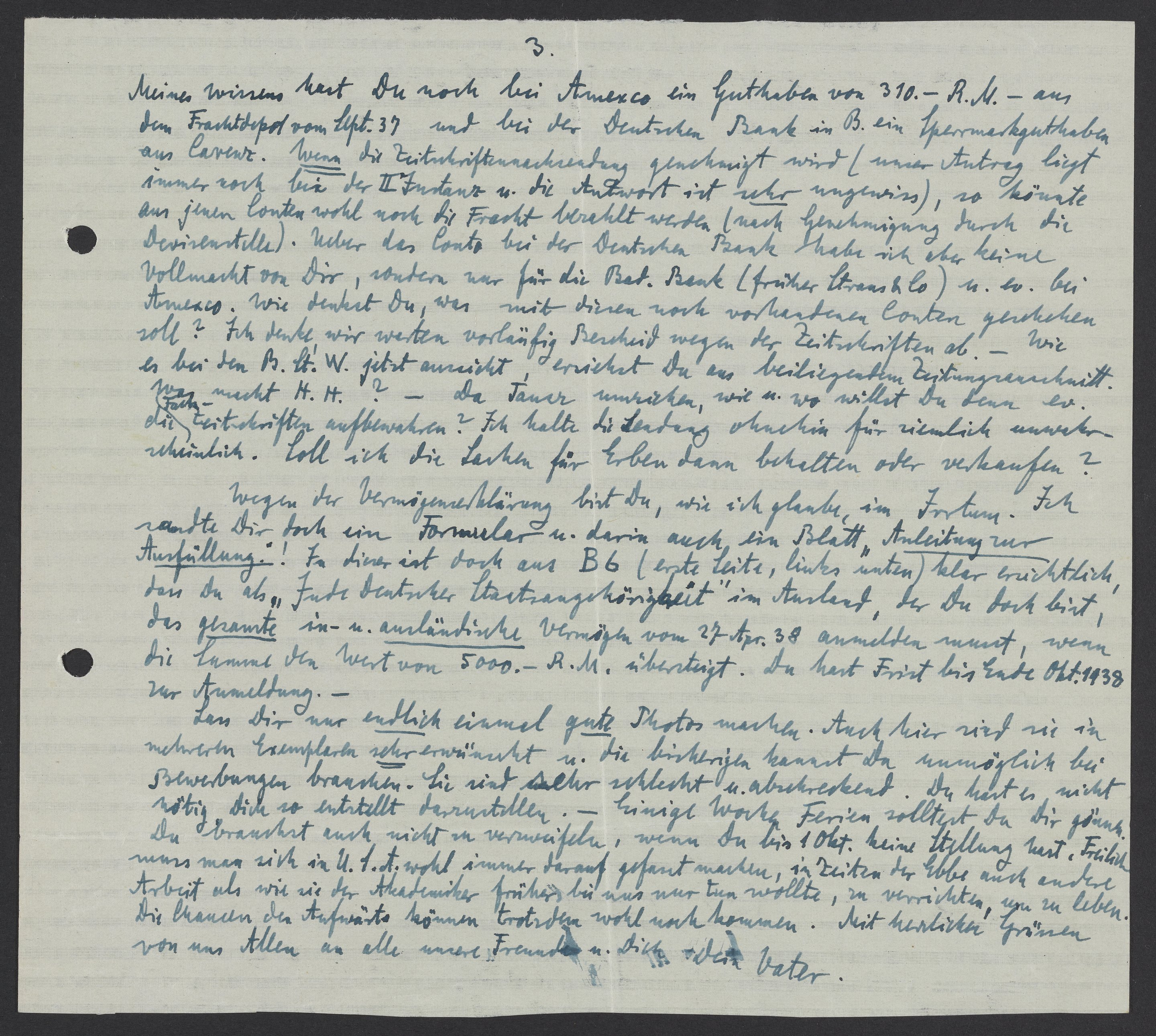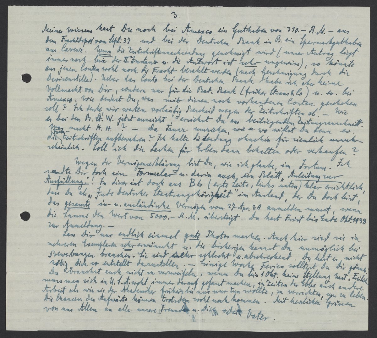 Wegen der Vermögenserklärung bist Du, wie ich glaube, im Irrtum. Ich sandte Dir doch ein Formular u. darin auch ein Blatt „Anleitung zur Ausfüllung“! In dieser ist doch aus B6 (erste Seite, links unten) klar ersichtlich, dass Du als „Jude Deutscher Staatsangehörigkeit“ im Ausland, der Du doch bist, das gesandte in – u. ausländische Vermögen vom 287. Apr. 38 anmelden musst, wenn die Summe den Wert von 5000. – R.M. übersteigt. Du hast Frist bis Ende Okt. 1938 zur Anmeldung.