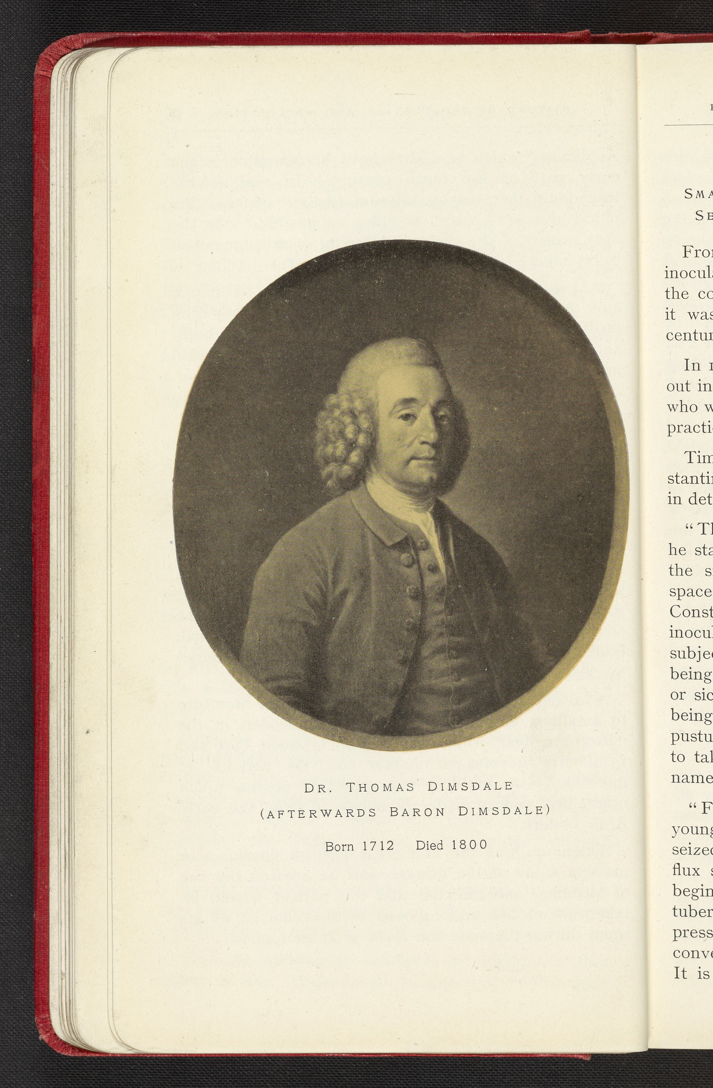 Portrait of Thomas Dimsdale, a practitioner of medicine recognized as a specialist in inoculation. Dimsdale was summoned by the Empress of Russia, Catherine II, in 1768 to introduce the practice of inoculation in Russia. Dimsdale performed an inoculation on the empress herself and much of St. Petersburg and Moscow. He was anointed a Baron for his contributions to the improvement of Russian well-being. The illustration precedes a chapter describing the circumstances by which inoculation practices emerged in various Eastern and Western countries.
