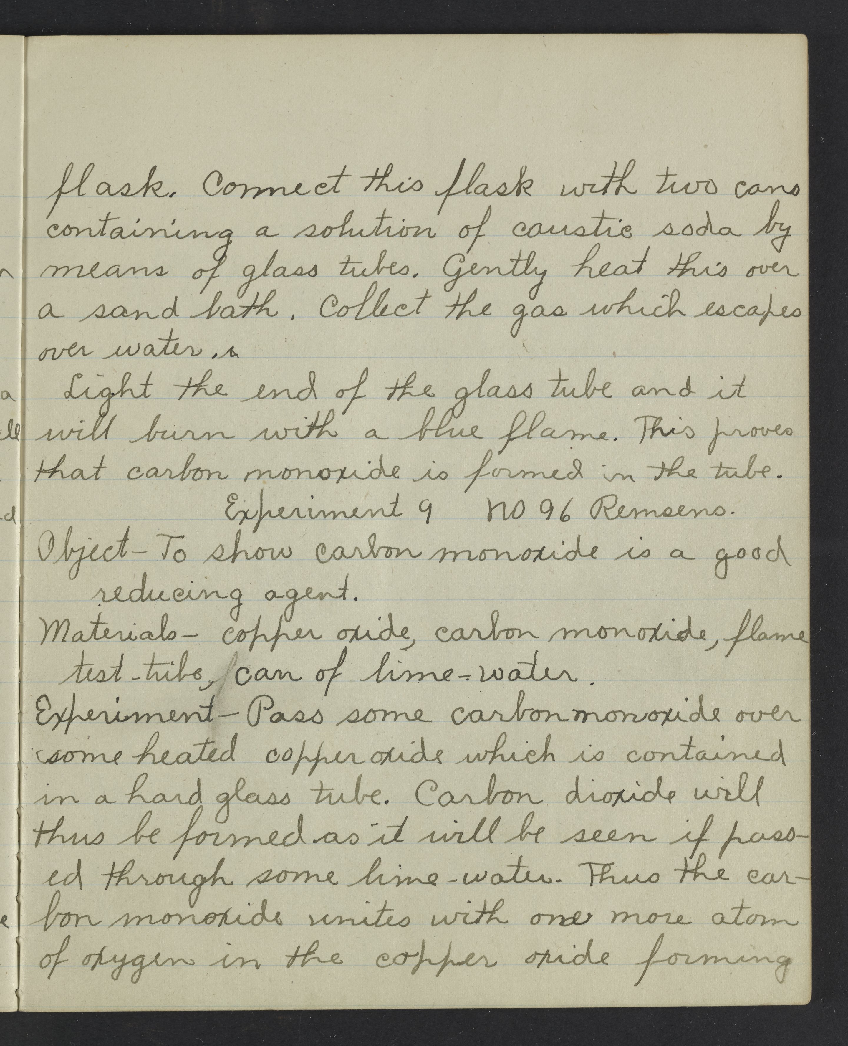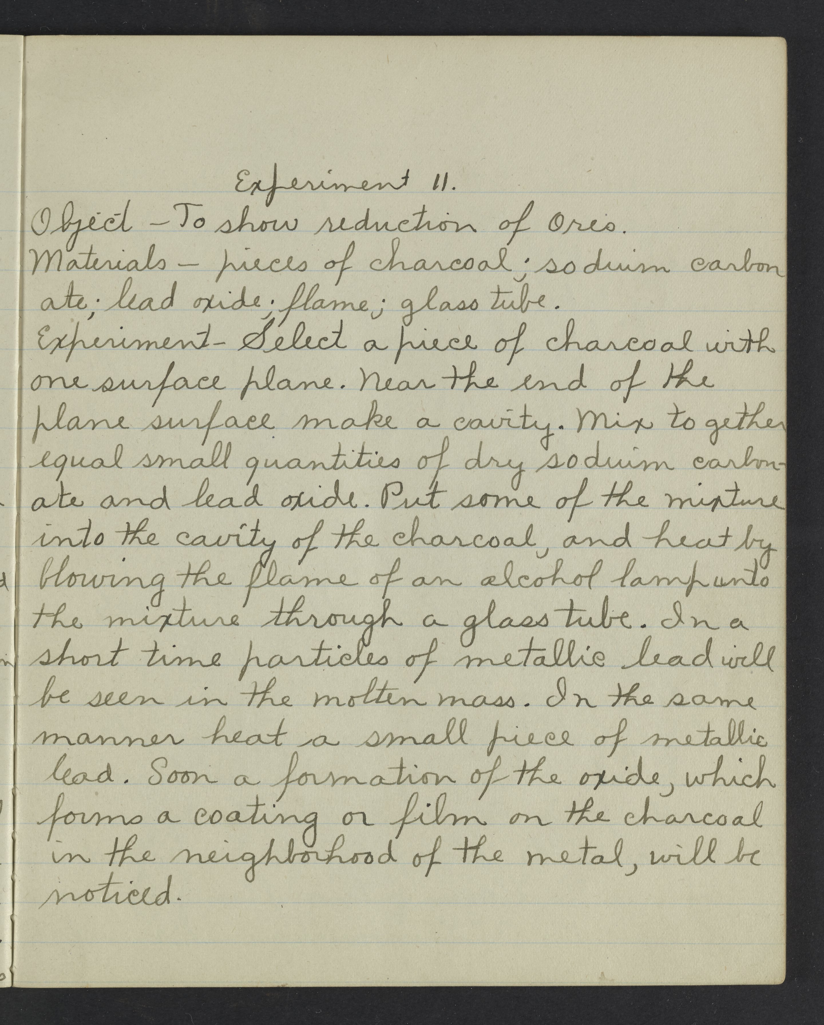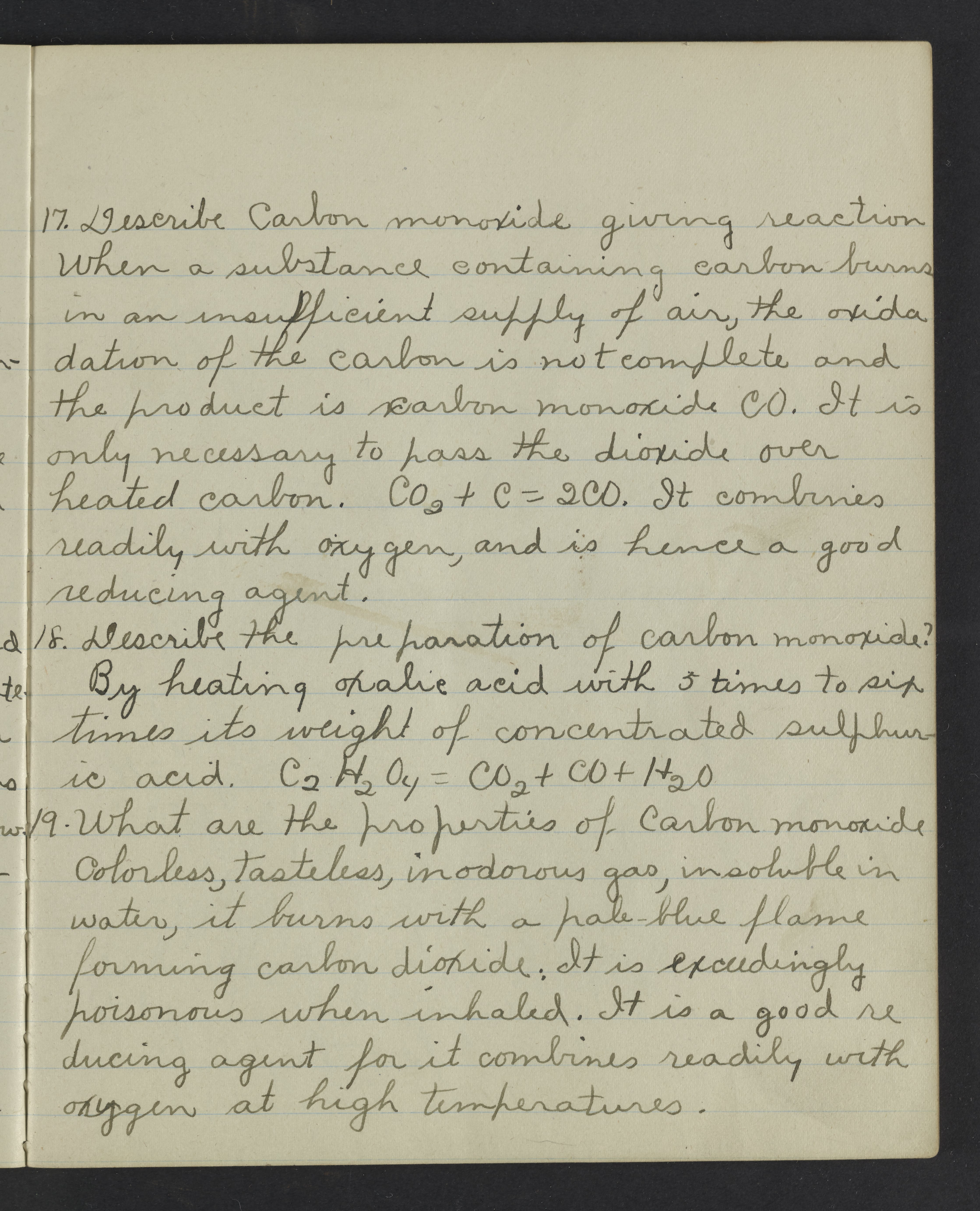 Small JPG1200 x 1414px — 362 KBLarge JPG2880 x 3394px — 2.1 MBFull-sized JPG4873 x 5743px — 5.3 MBOriginal fileTIFF — 4873 x 5743px — 80.1 MBNotebook used by Rose Agnes Brabenec (1889-1963) during a high school-level chemistry class in Chesterland, Ohio. The notebook begins with notes pertaining to carbon (chapter 11, page 176) and includes a variety of lecture notes, lists of chemical names and symbols, answers to textbook questions, and descriptions of various experiments. Topics covered include the occurrence of carbon in plants and animals, the properties and preparation of carbon dioxide, laws governing the combination of gases, and the extraction of sulphur. Notably, the names of Brabenec and her peers, the "class of 1907," are inscribed inside the back cover of the notebook.