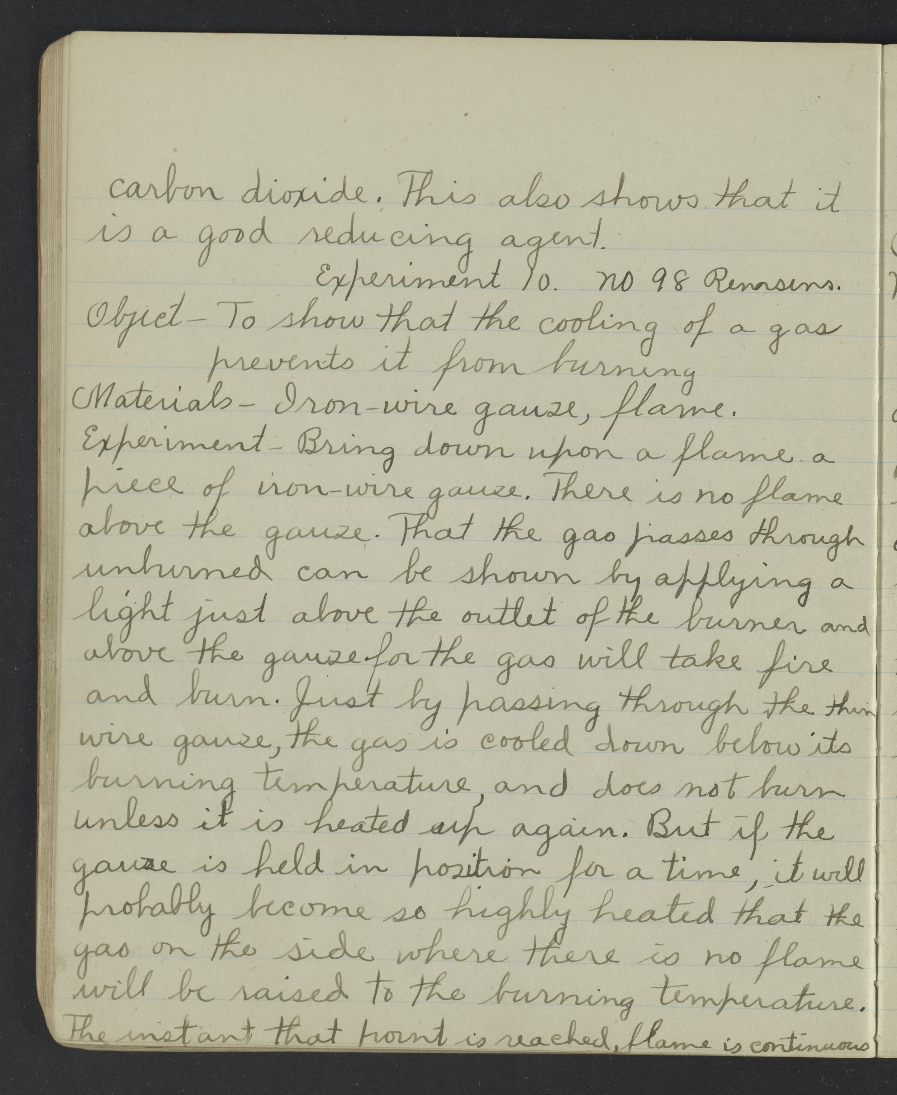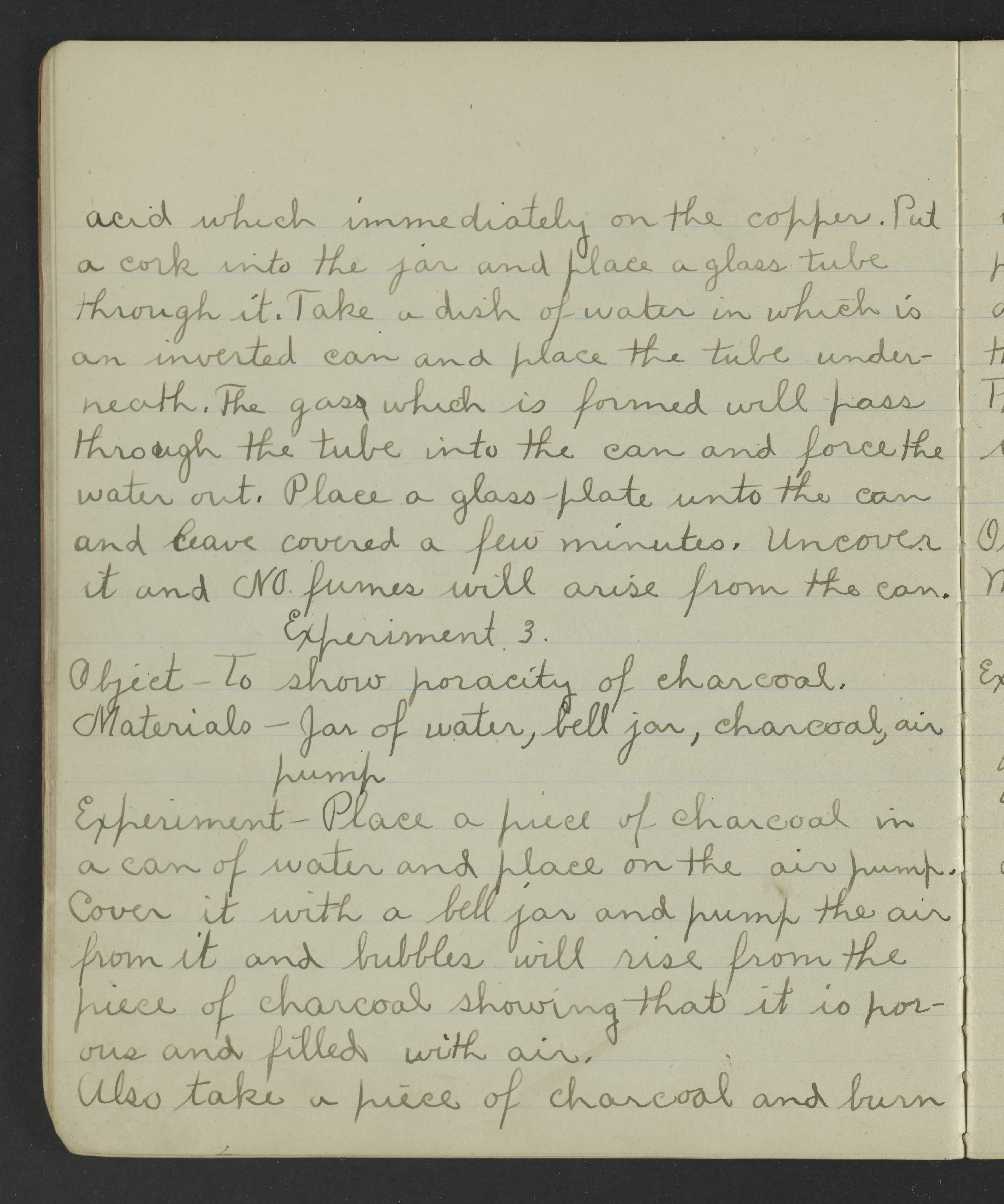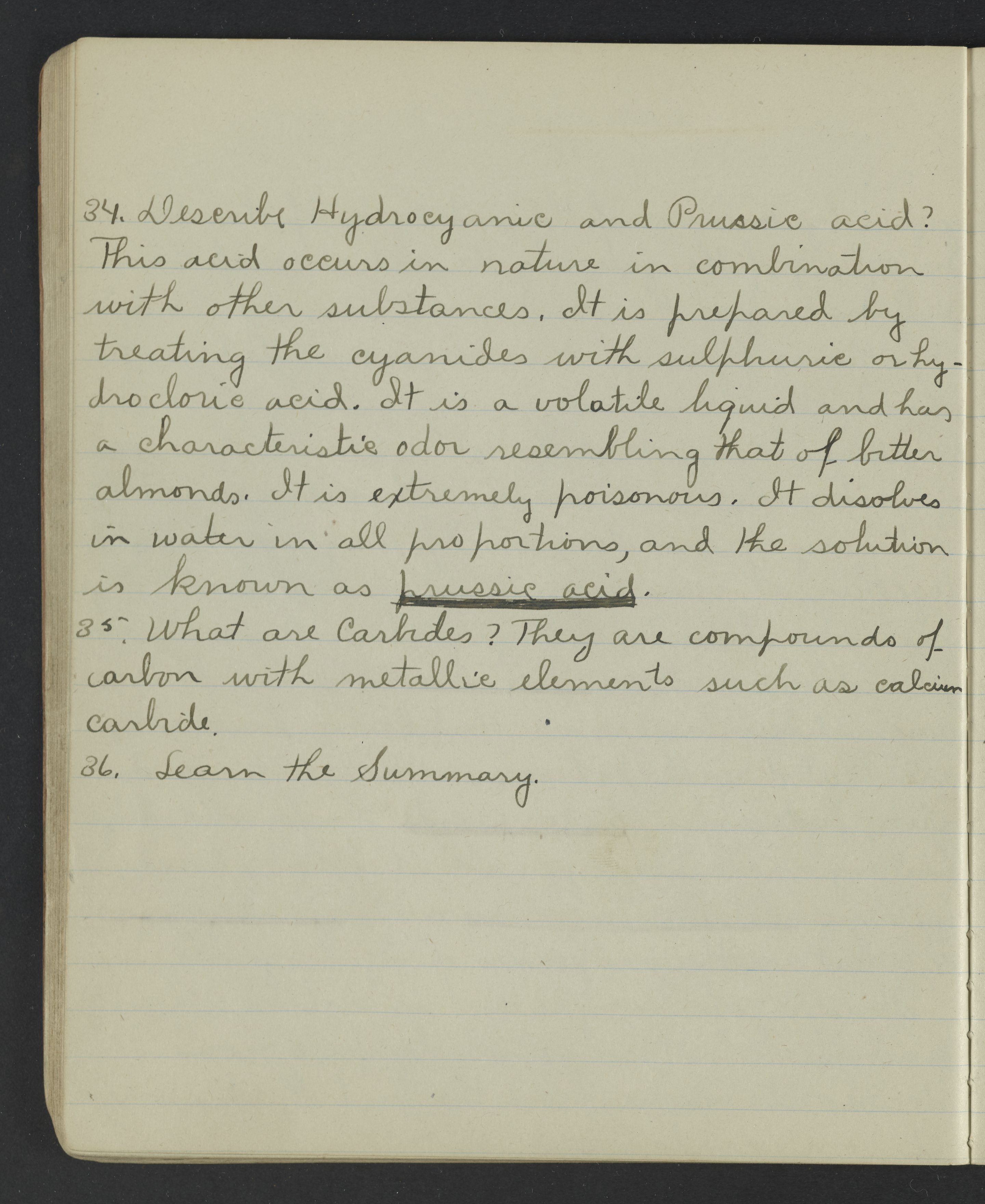 Small JPG1200 x 1414px — 362 KBLarge JPG2880 x 3394px — 2.1 MBFull-sized JPG4873 x 5743px — 5.3 MBOriginal fileTIFF — 4873 x 5743px — 80.1 MBNotebook used by Rose Agnes Brabenec (1889-1963) during a high school-level chemistry class in Chesterland, Ohio. The notebook begins with notes pertaining to carbon (chapter 11, page 176) and includes a variety of lecture notes, lists of chemical names and symbols, answers to textbook questions, and descriptions of various experiments. Topics covered include the occurrence of carbon in plants and animals, the properties and preparation of carbon dioxide, laws governing the combination of gases, and the extraction of sulphur. Notably, the names of Brabenec and her peers, the "class of 1907," are inscribed inside the back cover of the notebook.