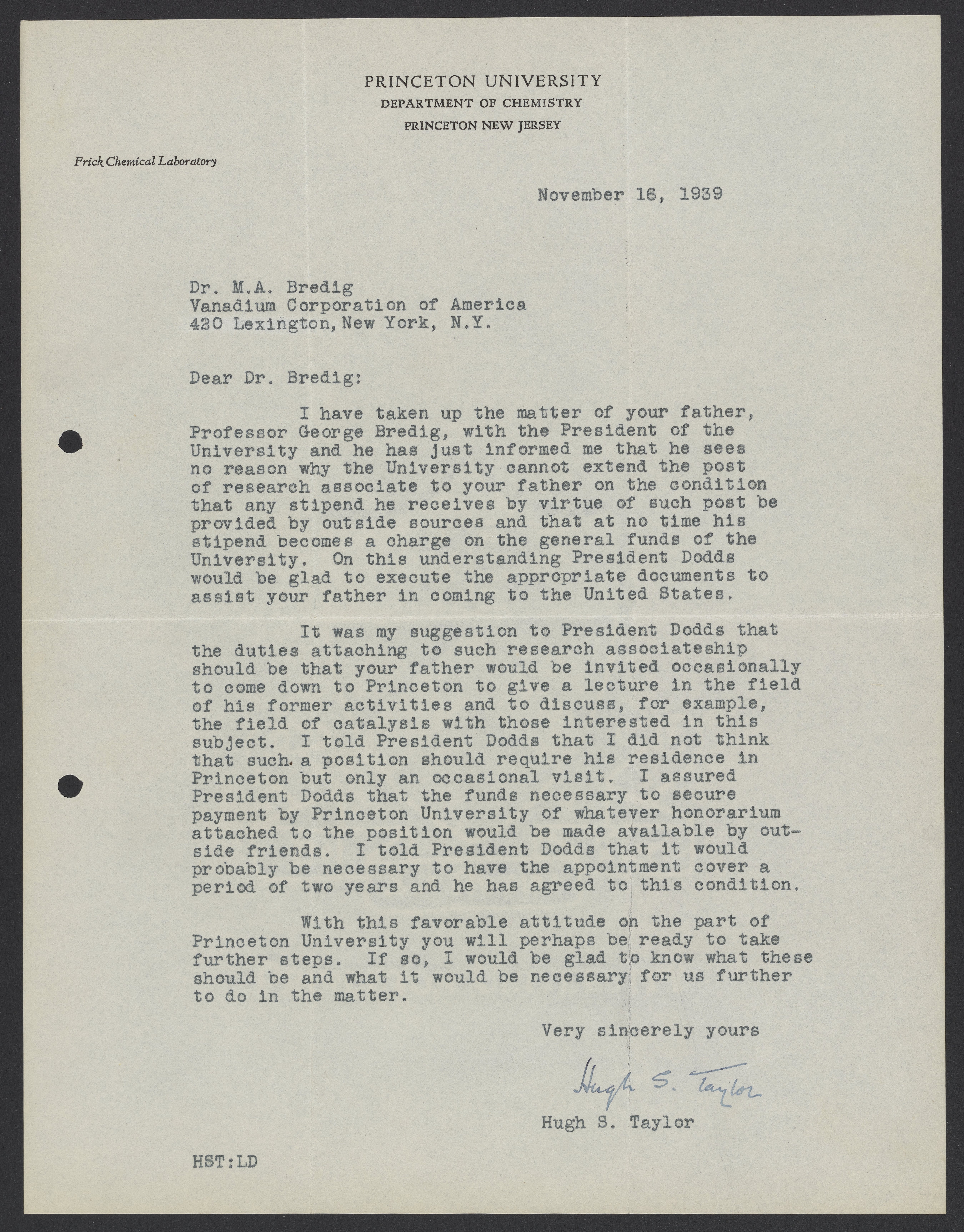 Hugh S. Taylor (1890-1974) informs Max Bredig (1902-1977) that the President of Princeton University, Harold Willis Dodds (1889-1980), believes Princeton may be able to offer Georg Bredig (1868-1944) a research associate position. This position would allow Georg to immigrate to the United States.