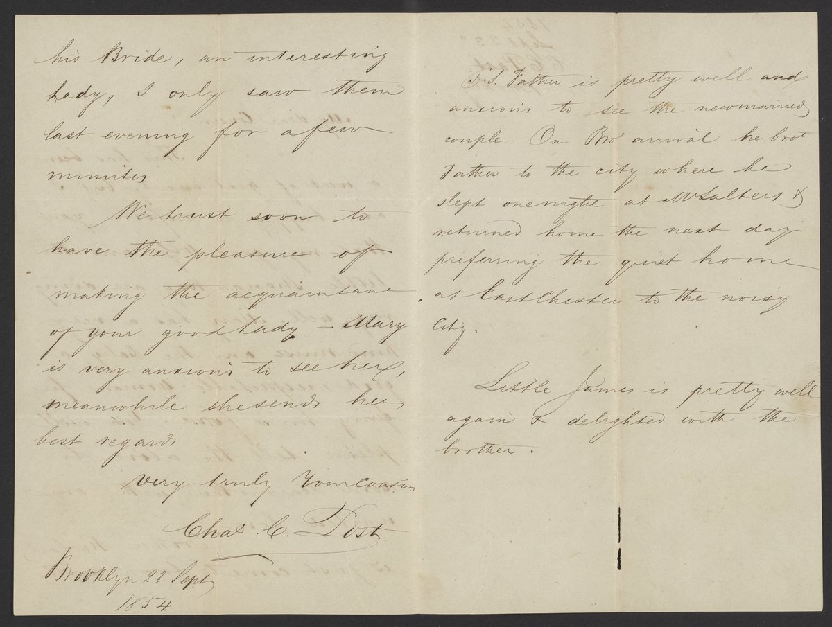 Small JPG1200 x 1761px — 283 KBFull-sized JPG2141 x 3142px — 763 KBOriginal fileTIFF — 2141 x 3142px — 19.3 MBCharles C. Post, a cousin of James Curtis Booth (1810-1888) writes to Booth to discuss the health of Post's wife and child.