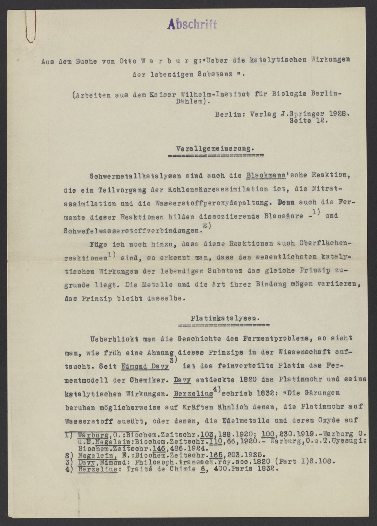 “Aus Dem Buche Von Otto Warburg: Ueber Die Katalytischen Wirkungen Der Lebendigen Sustanz,” 1928. Papers of Georg and Max Bredig, Box 5, Folder 3. Science History Institute. Philadelphia. https://digital.sciencehistory.org/works/l4bfrt9.