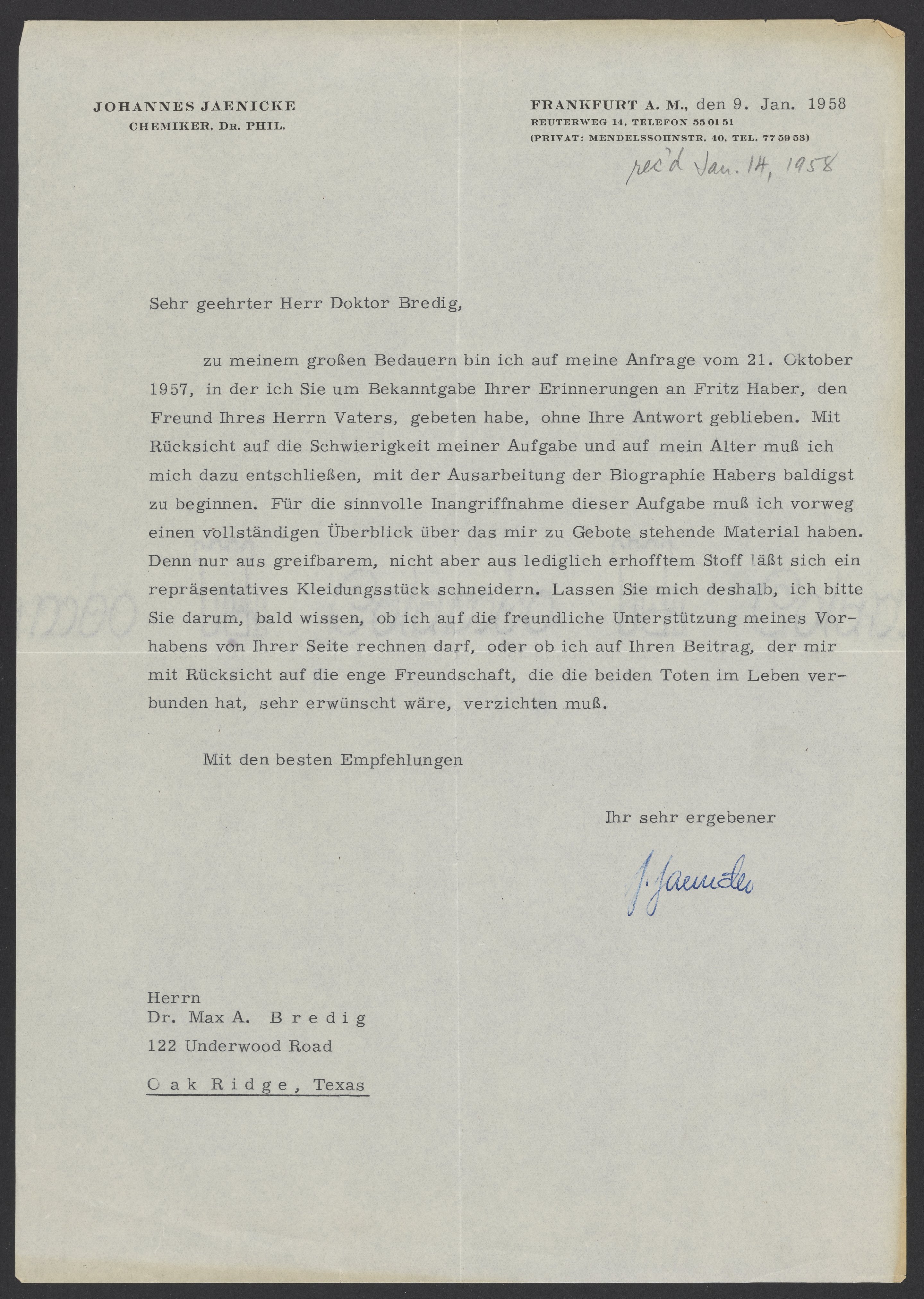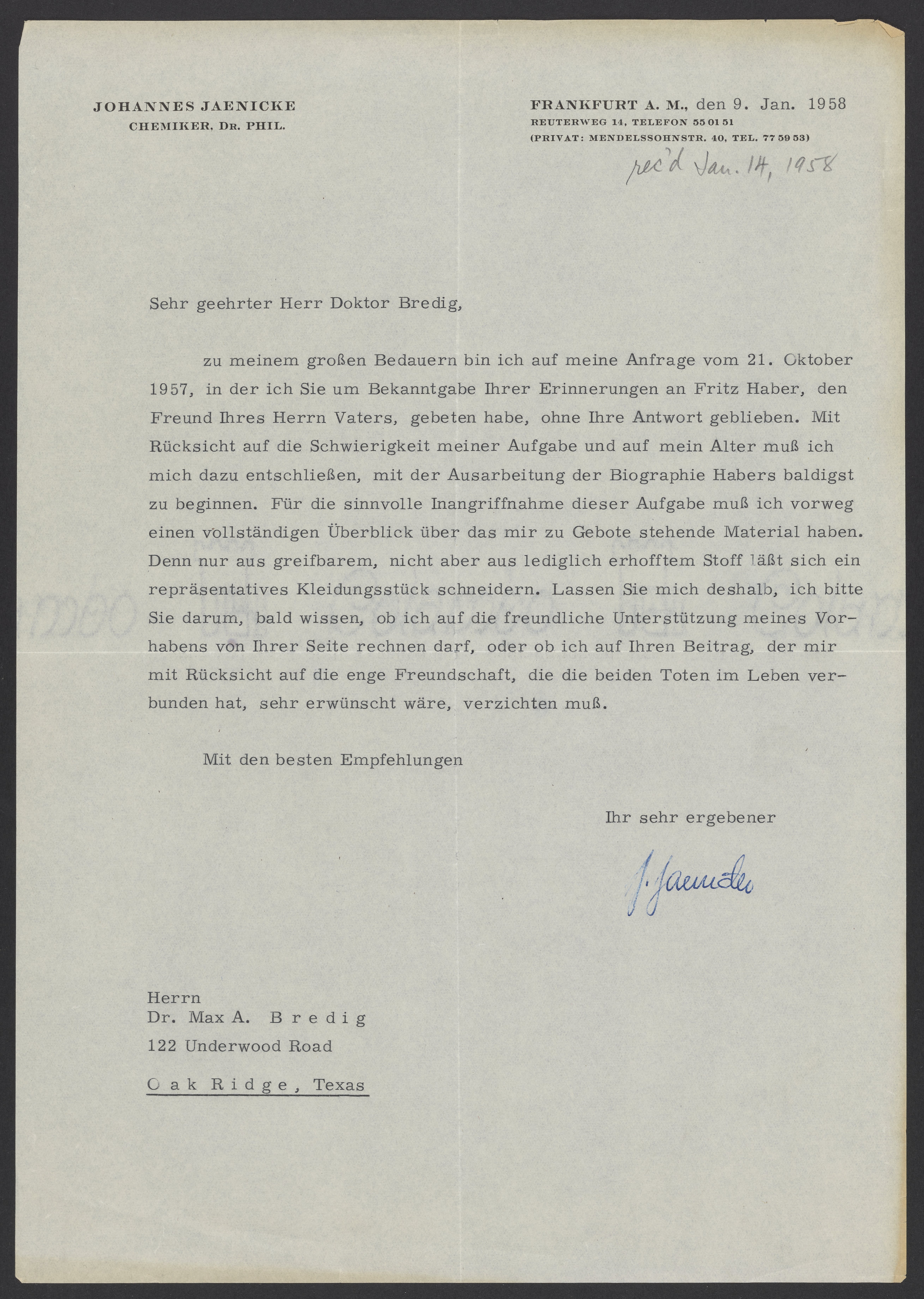 Johannes Jaenicke (1888-1984) requests that Max Bredig (1902-1977) contribute memories of Fritz Haber (1868-1934) for a biography that he is writing. Fritz Haber was a German chemist who won the Nobel Prize in Chemistry in 1918.