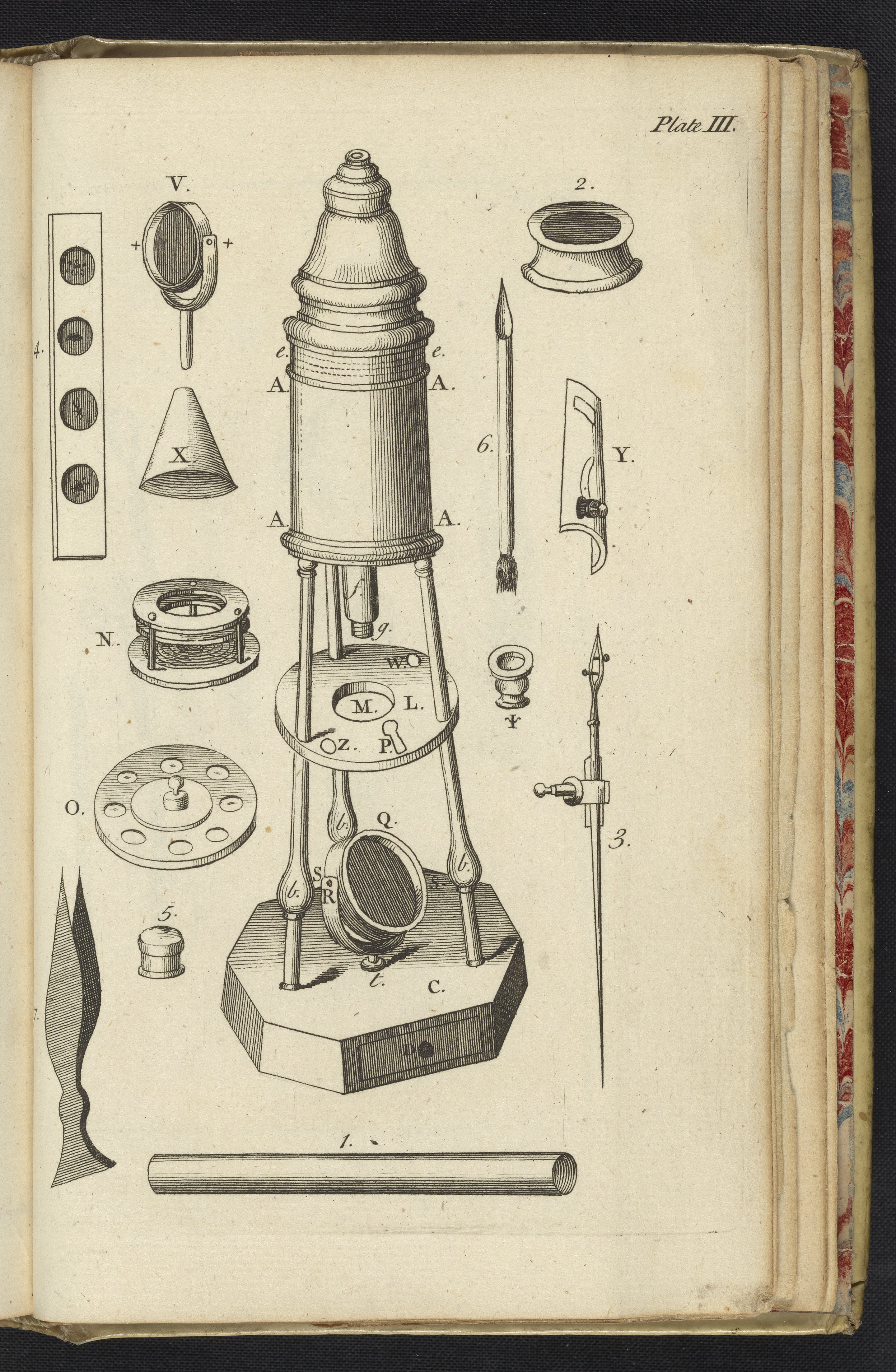 Plate III depicts the double reflecting microscope, which is described as having a greater ease of use than John Marshall's (1663-1725) great double microscope. The components and operation are discussed in detail in chapter V. The double reflection illuminates specimens, providing greater clarity. Concave glass is used to retain liquid specimens. Glass tubes are used to immobilize living organisms for examination.