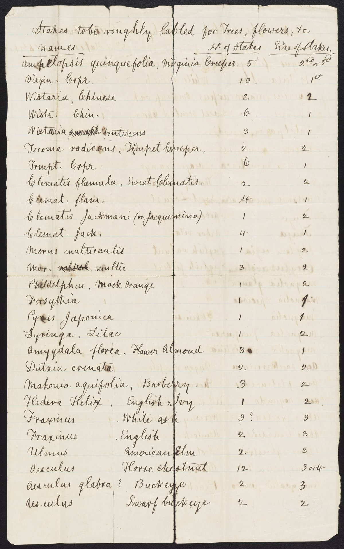 Booth, James Curtis. “Stakes to Be Roughly Labeled for Trees, Flowers, Etc.,” circa 1884. Papers of James Curtis Booth, Box 2, Folder 10. Science History Institute. Philadelphia. https://digital.sciencehistory.org/works/l73mssf.