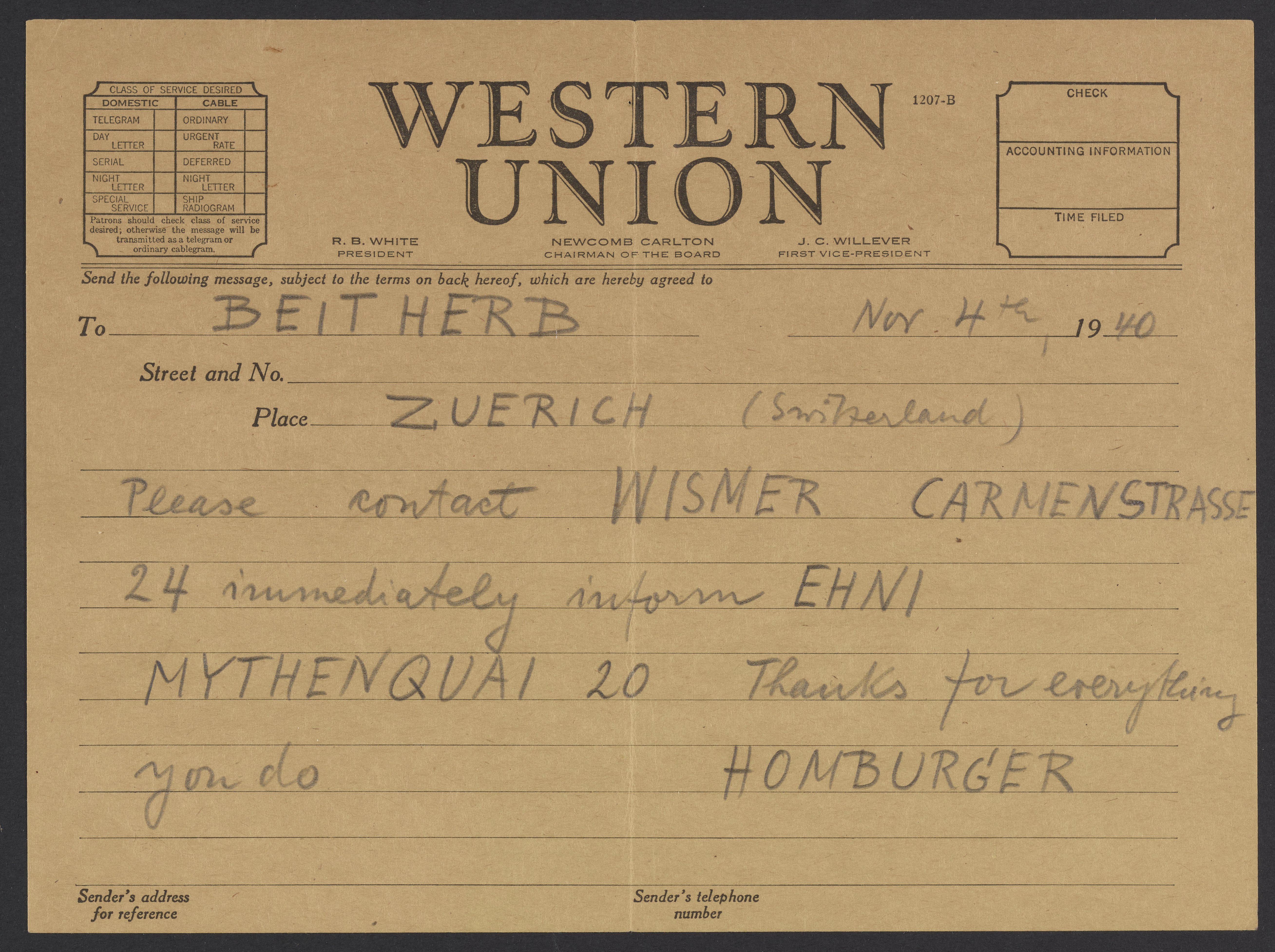 Telegram from Marianne Homburger to Herbert Beit, November 4, 1940
