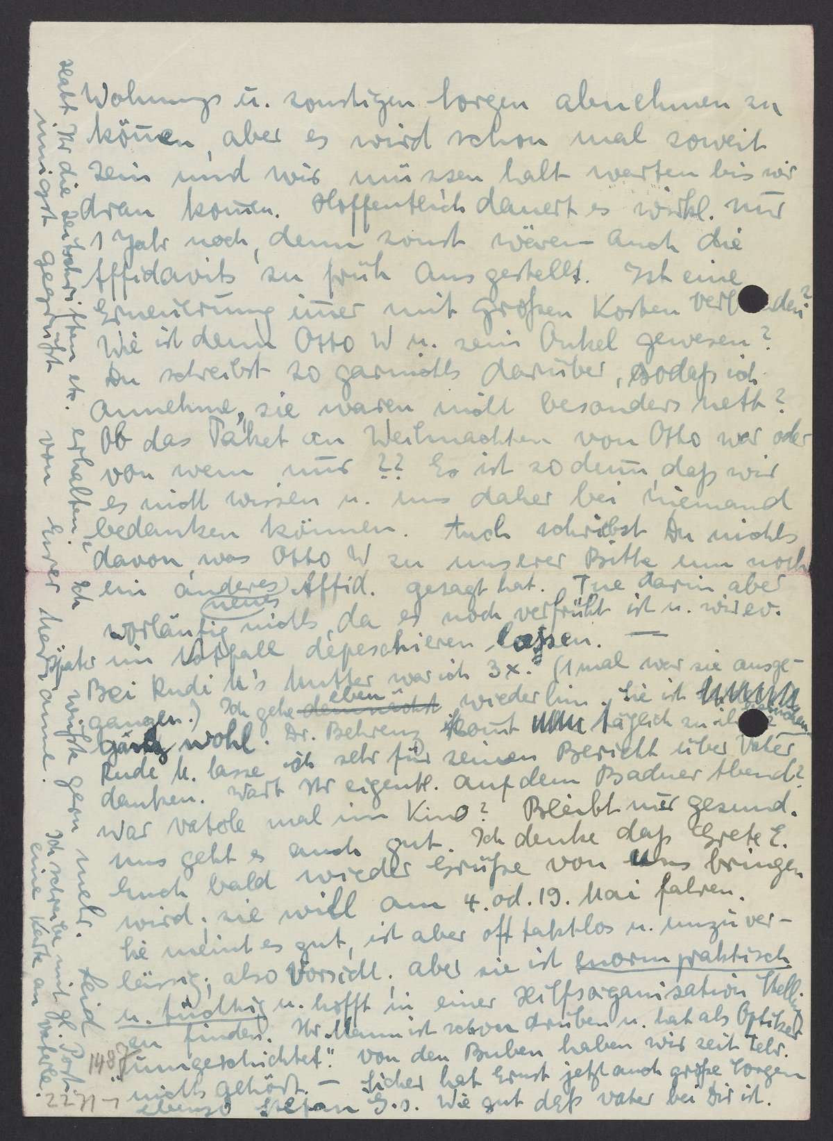 alleviate your housing and other concerns. However, the time will come, and we’ll just have to wait until it’s our turn. I hope it will only take one more year. Otherwise, the affidavits would have been issued too early. Are renewals always difficult? What were Otto W. and his uncle like? You haven’t written about it at all, so I assume they weren’t very nice? If the package at Christmas wasn’t from Otto, from whom was it? It’s so senseless that we don’t know and therefore can’t thank anyone. You also didn’t write anything about what Otto W. said about our request for yet another new affidavit. Do nothing about it for the time being, especially since it is still too early, and we may have it cabled to us later in an emergency.