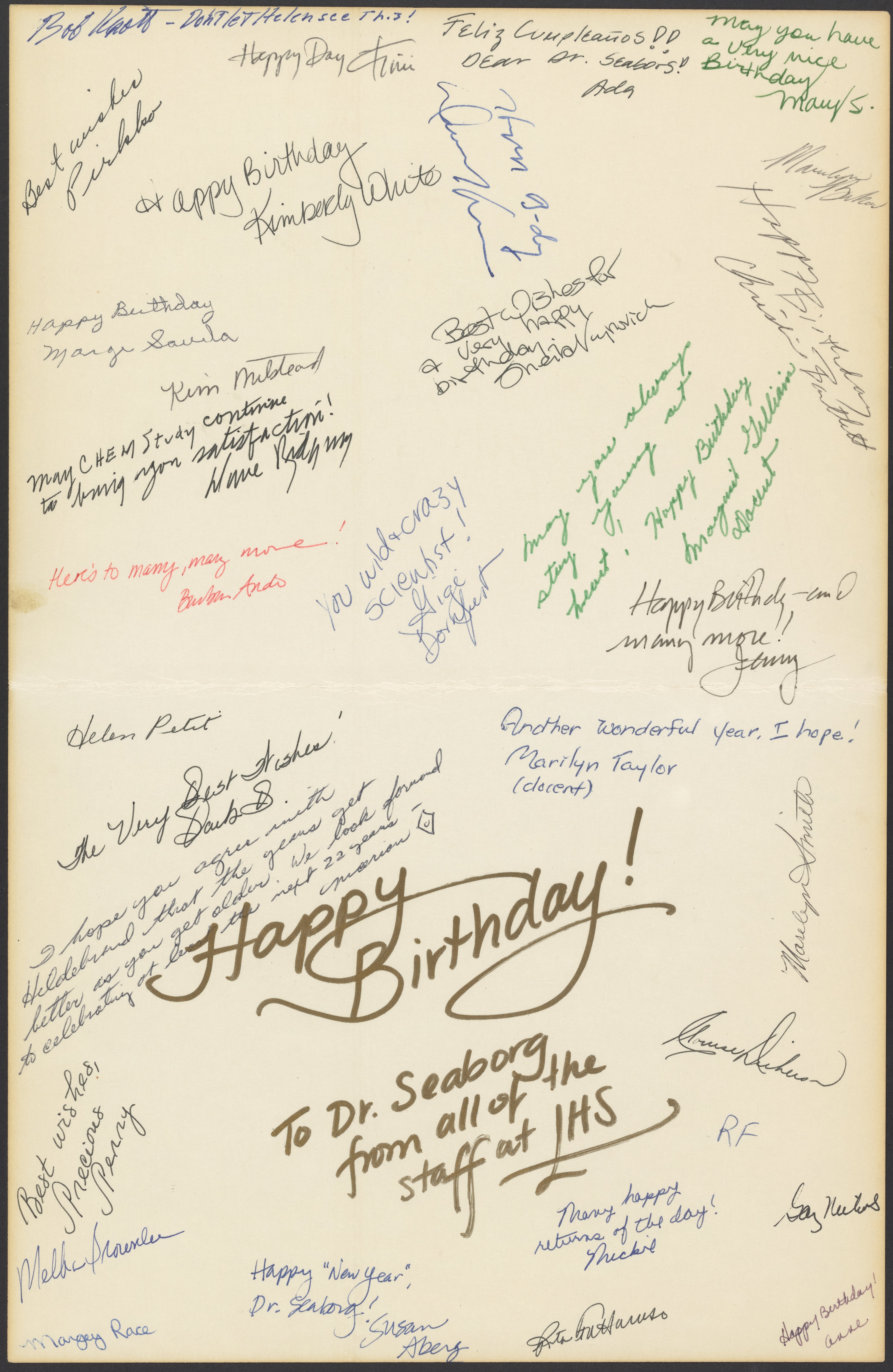 “Handmade Birthday Card for Glenn Seaborg,” circa 1984. Records of the Lawrence Berkeley National Laboratory - Nuclear Division, Box 15. Science History Institute. Philadelphia. https://digital.sciencehistory.org/works/ldecvga.