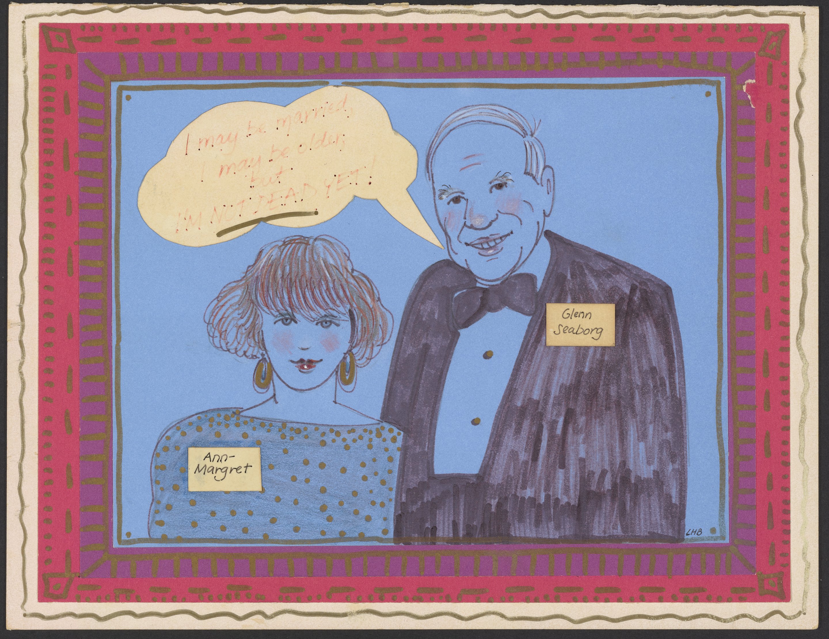 Small JPG1200 x 926px — 216 KBLarge JPG2880 x 2222px — 1.4 MBFull-sized JPG5650 x 4360px — 5.2 MBOriginal fileTIFF — 5650 x 4360px — 70.5 MBBirthday card for Glenn Seaborg (1912-1999) signed by his colleagues and staff at the Lawrence Hall of Science. The card is hand illustrated with a drawing of Seaborg with Swedish-American actress and singer, Ann-Margret Olsson (1941-). The drawing is a copy of a photograph taken of the two at the Great Swedish Heritage Award ceremony. A speech bubble emerges from Seaborg's mouth and reads "I may be married, I may be older, but I'M NOT DEAD YET!"