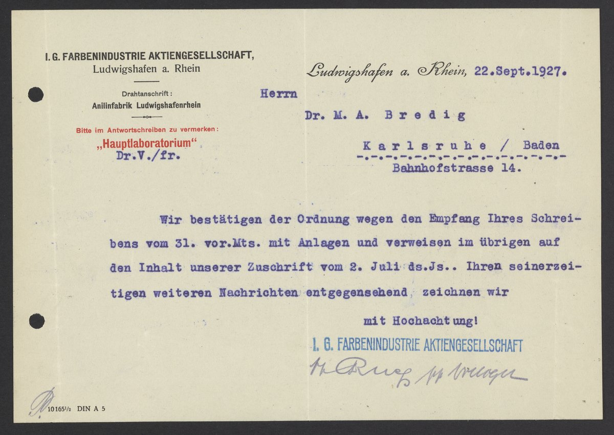 Interessengemeinschaft Farbenindustrie Aktiengesellschaft. “Letter from I.G. Farben to Max Bredig, September 22, 1927,” September 22, 1927. Papers of Georg and Max Bredig, Box 8, Folder 35. Science History Institute. Philadelphia. https://digital.sciencehistory.org/works/ldo4sol.