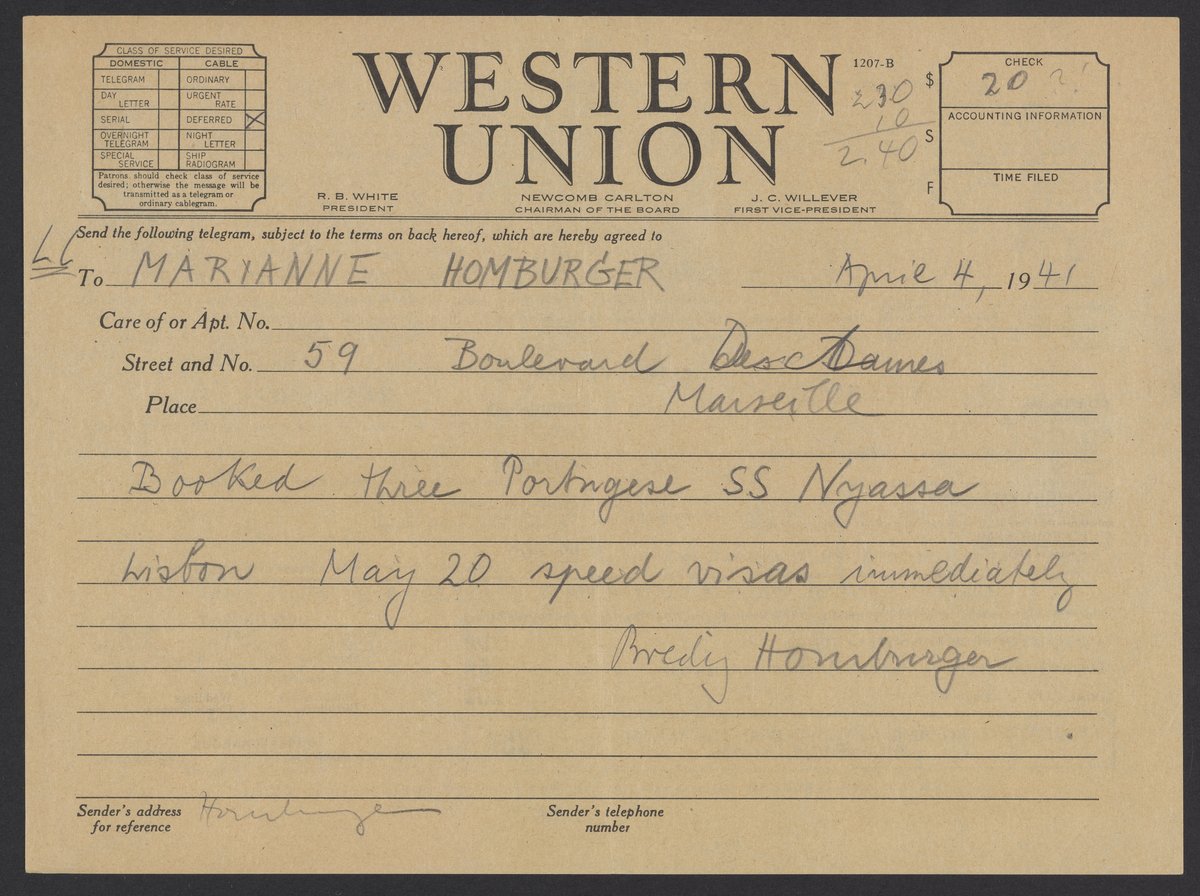 Telegram from Max Albert Bredig (1902-1977) informing his sister Marianne Homburger (1903-1986) that he has secured three tickets for the S.S. Nyassa.